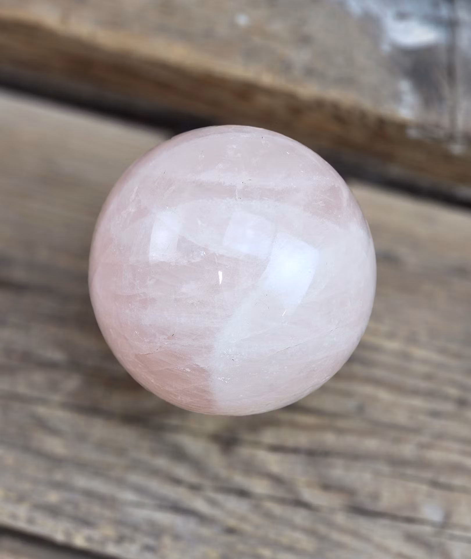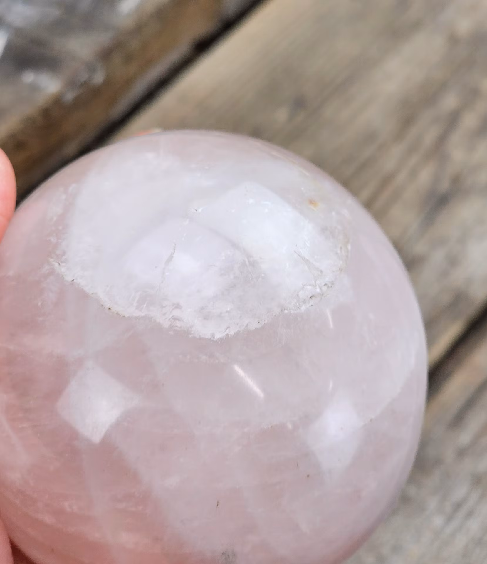 Mycket vackert stort polerat klot i Rosenkvarts med vacker färg. Nedsatt pris 30% p.g.a. lite skada/skavanker, se närbild. Observera att klotställ ingår ej, dessa köpes separat hos oss. Tänk på att kristaller kommer från naturen & naturliga sprickor samt ojämnhet kan förekomma. Färger kan skilja sig beroende på hur ljuset faller ner på kristallen samt även mellan olika bildskärmar m.m.