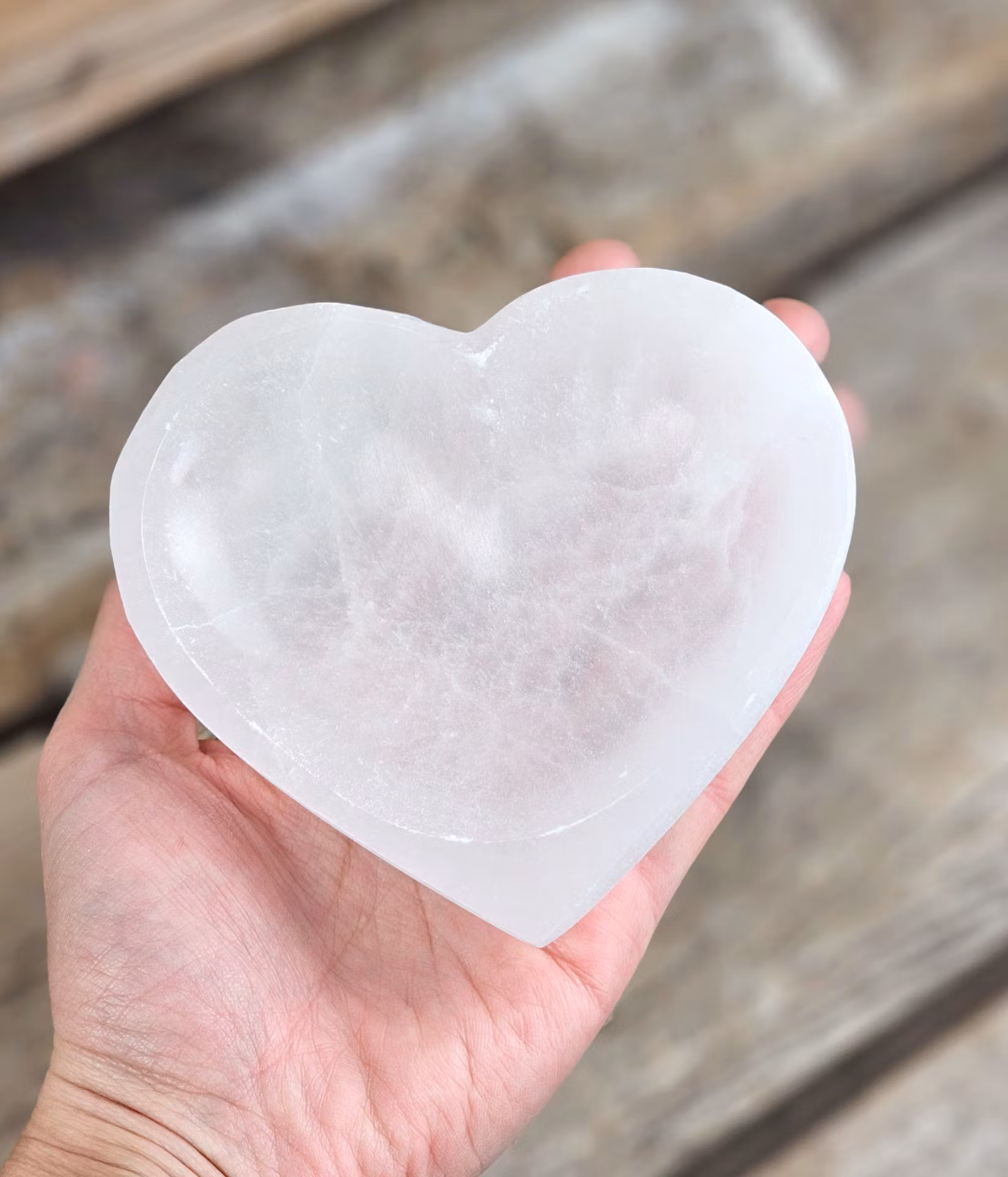 Vit Selenit, hjärta skål 10 cm -30% fynd små defekter