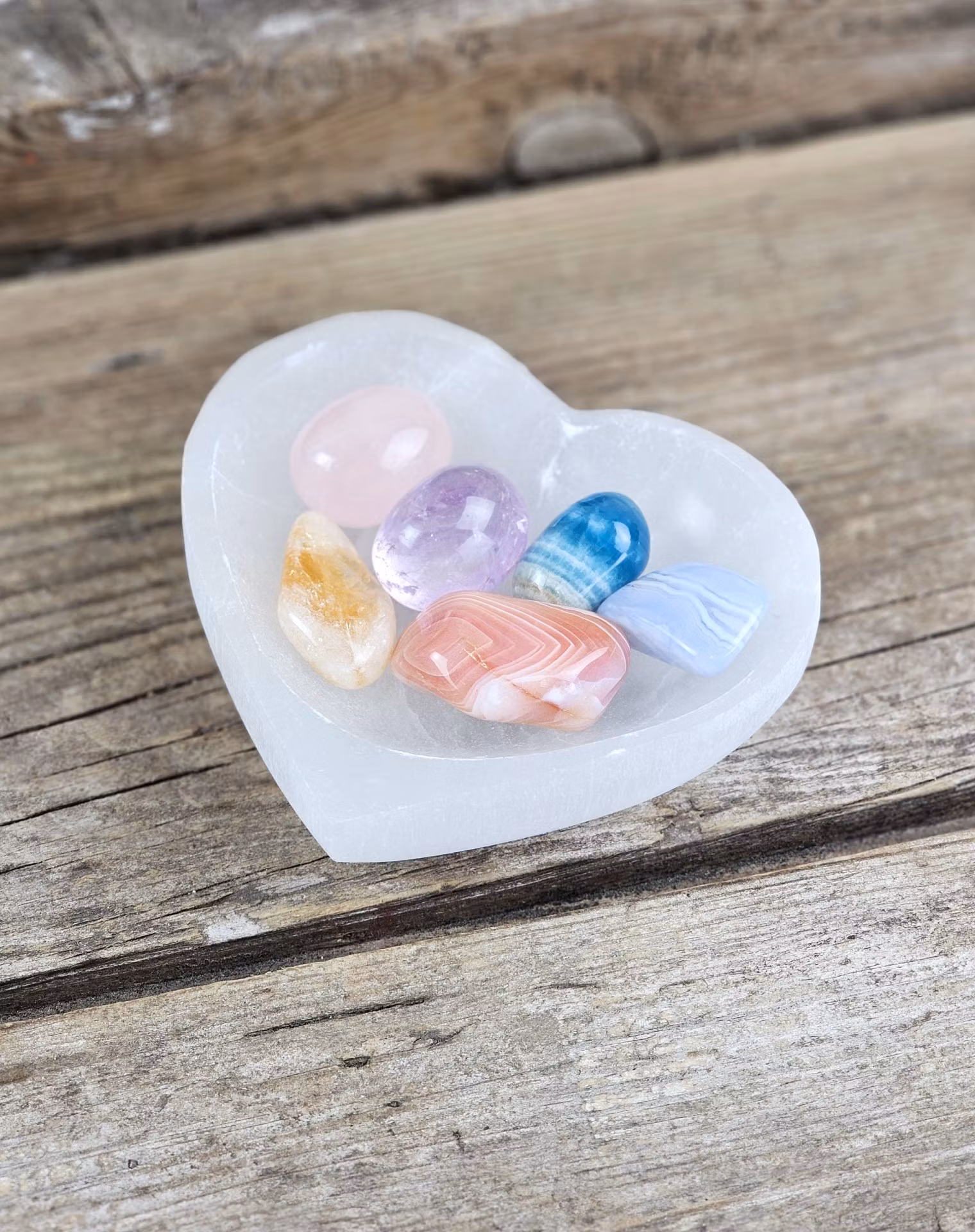 Vacker polerad skål i Vit Selenit med formen av ett hjärta. Jättefin förvaring till t.ex. dina trumlade stenar eller smycken! Observera att kristallerna i skålen inte ingår, dessa köpes separat i vår butik. Skålarna säljes styckvis. De skiftar i utseende. Du köper en slumpvis liknande skål enligt text & bild ovan. Tänk på att kristaller kommer från naturen & naturliga sprickor & ojämnheter kan förekomma. Färger kan skilja sig beroende på hur ljuset faller ner på kristallen samt även mellan olika bildskärmar m.m.