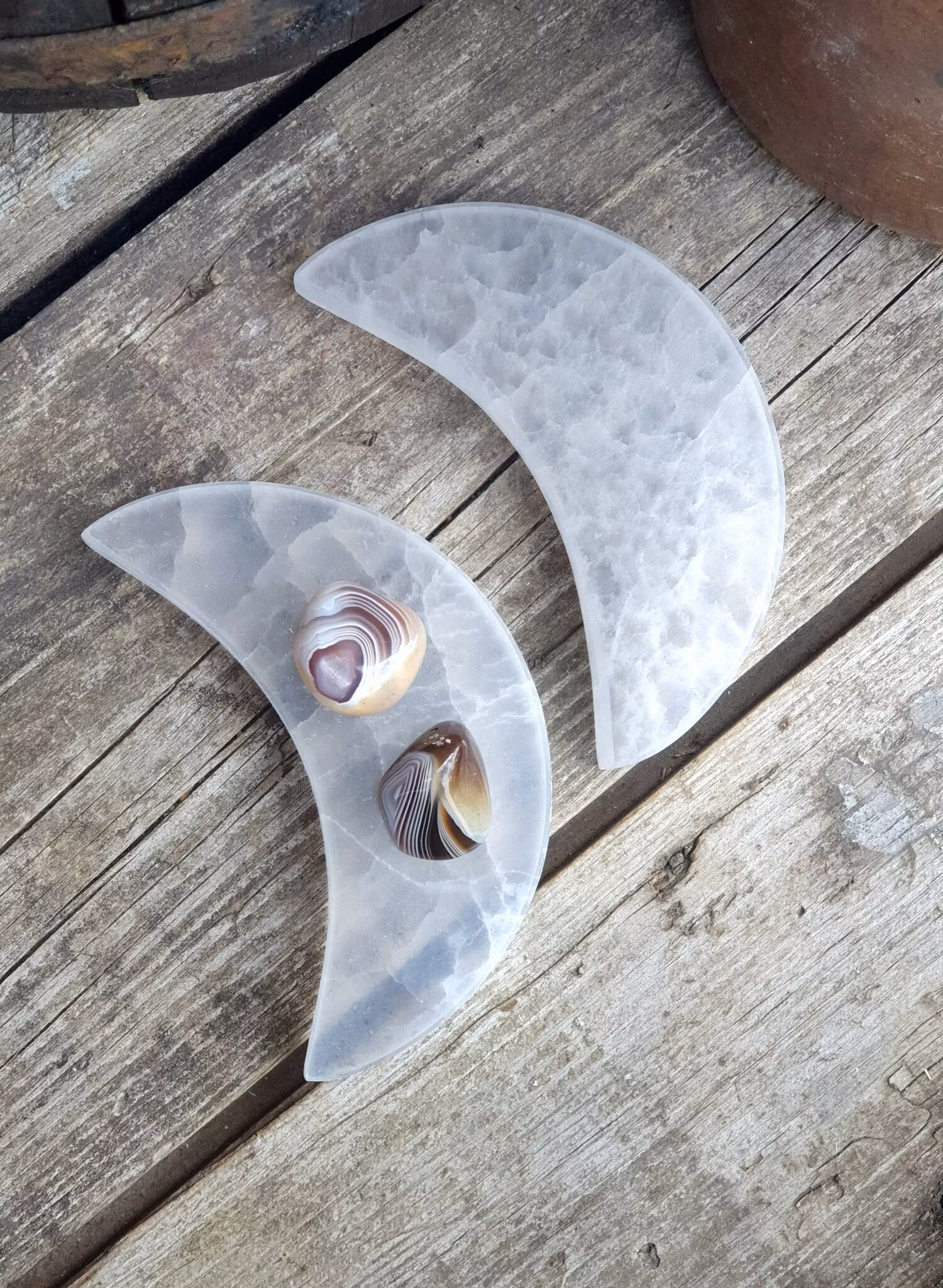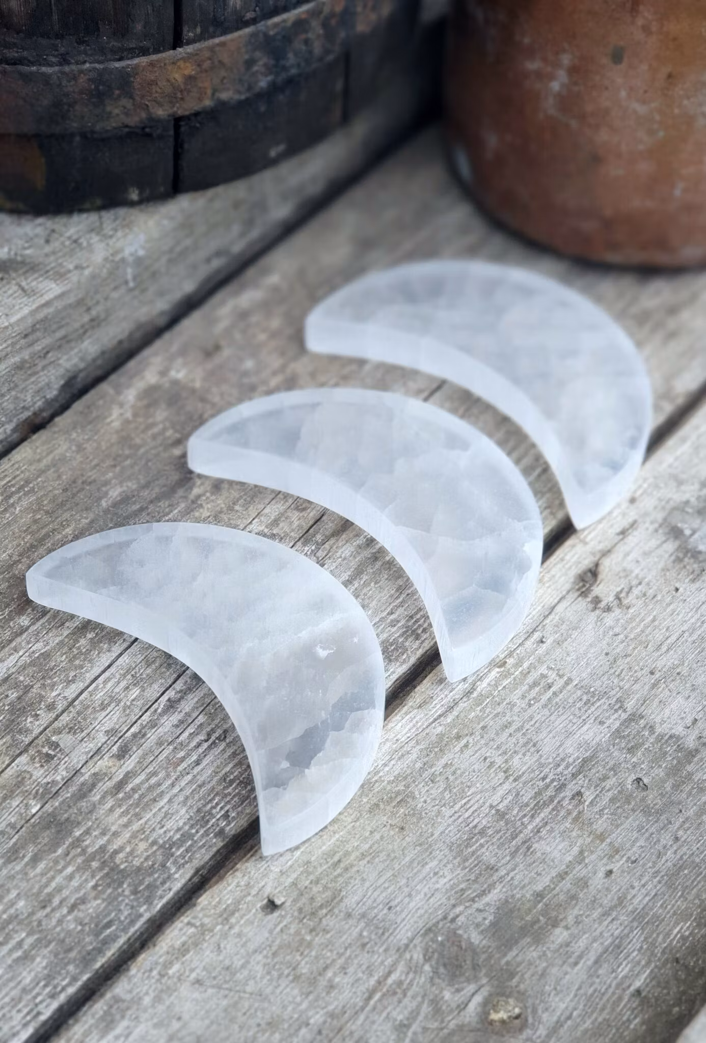 Mycket vacker polerad måne i Vit Selenit. Säljes styckvis. De skiftar i utseende. Du köper en slumpvis liknande kristall enligt text & bild ovan. Tänk på att kristaller kommer från naturen & naturliga sprickor & ojämnhet kan förekomma. Färger kan skilja sig beroende på hur ljuset faller ner på kristallen samt även mellan olika bildskärmar m.m.
