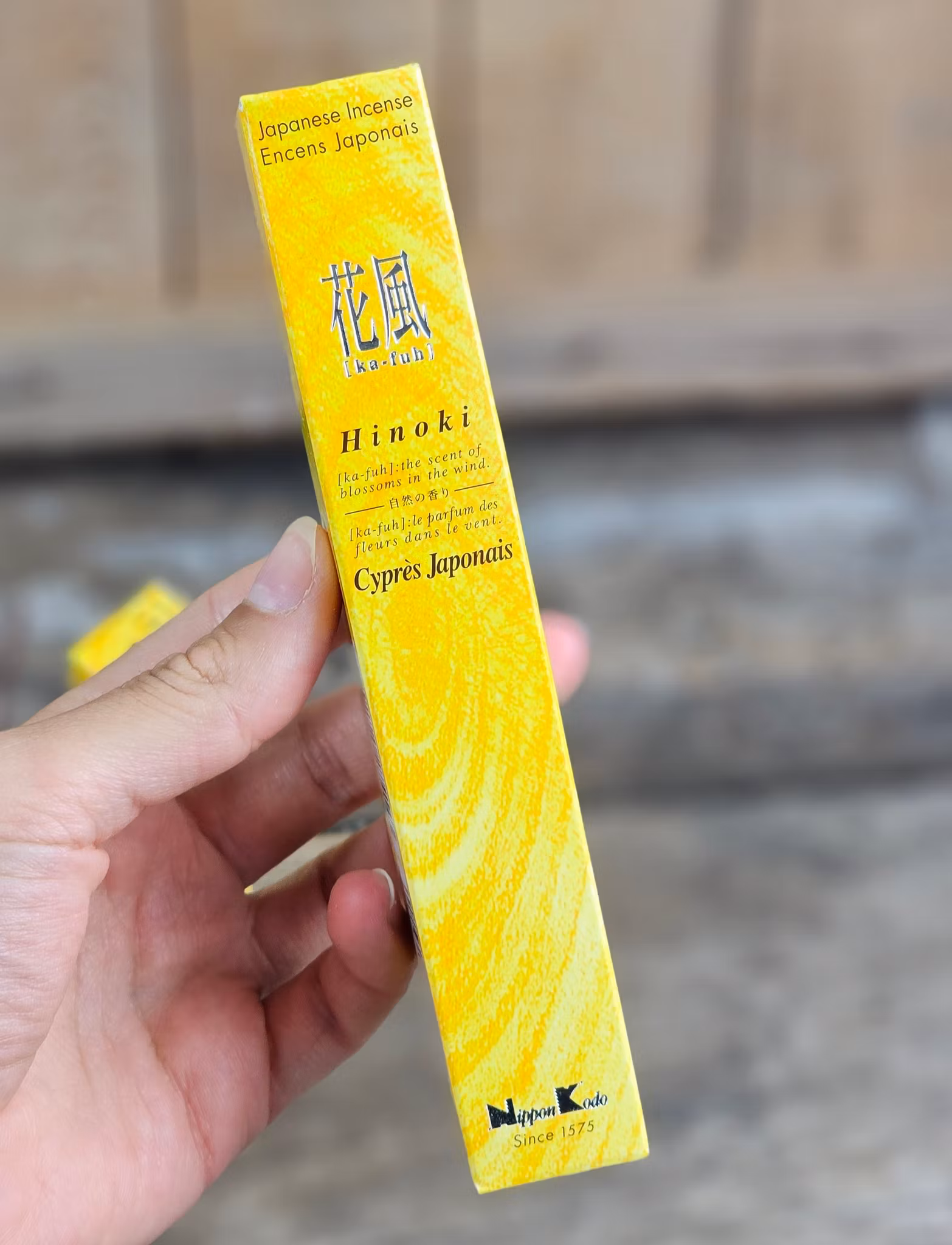 Doft: Hinoki Cypress. Ka-fuh Hinoki fångar doften av det majestätiska japanska cypressträdet, som växer rakt och högt för att ta sin plats i den japanska själens hemland. Den är gjord av riklig naturlig hinoki-essens och andra cypressarter för att uttrycka en ännu mer raffinerad känsla av njutning. Denna rökelse är mjuk och naturlig och dess milda doft kommer att sitta kvar länge i hjärtat. Upplev den friska, torra och uppiggande doften av en cypressskog som stimulerar tänkandet och klargör sinnet. Hinoki-trä är också känt för sina antibakteriella egenskaper. Koncentration och beslut.