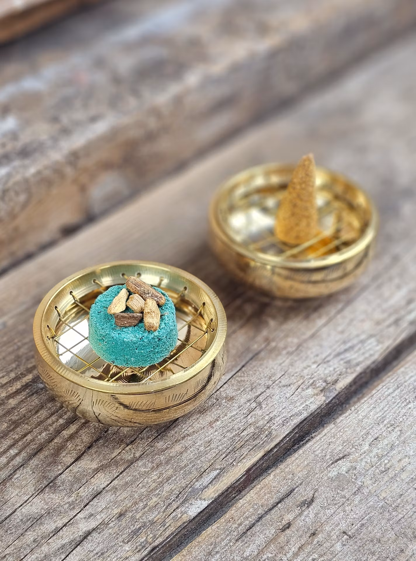 En vacker rökelsebrännare i mässing. Dessa hållare är anpassade för flera ändamål; antingen för att bränna kol ihop med smudge resin på nätet, bränna salvia i eller lägga sand i botten och ställa en rökelsekon i. Tänk på att rökelsebrännaren blir varm, placeras på en värmetålig plats. Lämna aldrig tända rökelser obevakade. Håll utom räckhåll från barn och djur. Ventilera väl, ha gärna ett fönster öppet när du använder dig av rökelser så att röken kan ta sig ut. Rengörs med fuktad trasa och mild såpa, produkten tål ej maskindisk eller mikrovågsugn. Säljes styckvis. Rökelser ingår ej, köpes separat i vår butik. Färger kan skilja sig beroende på hur ljuset faller ner på produkten samt även mellan olika bildskärmar m.m.