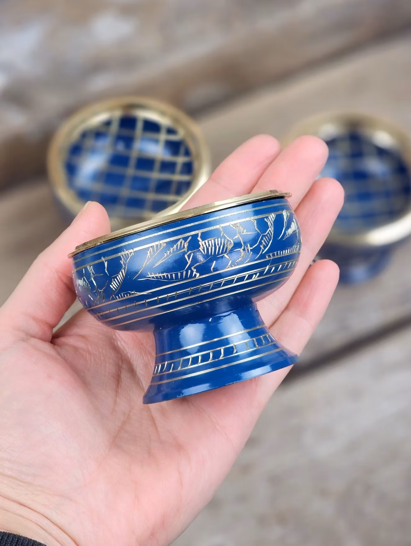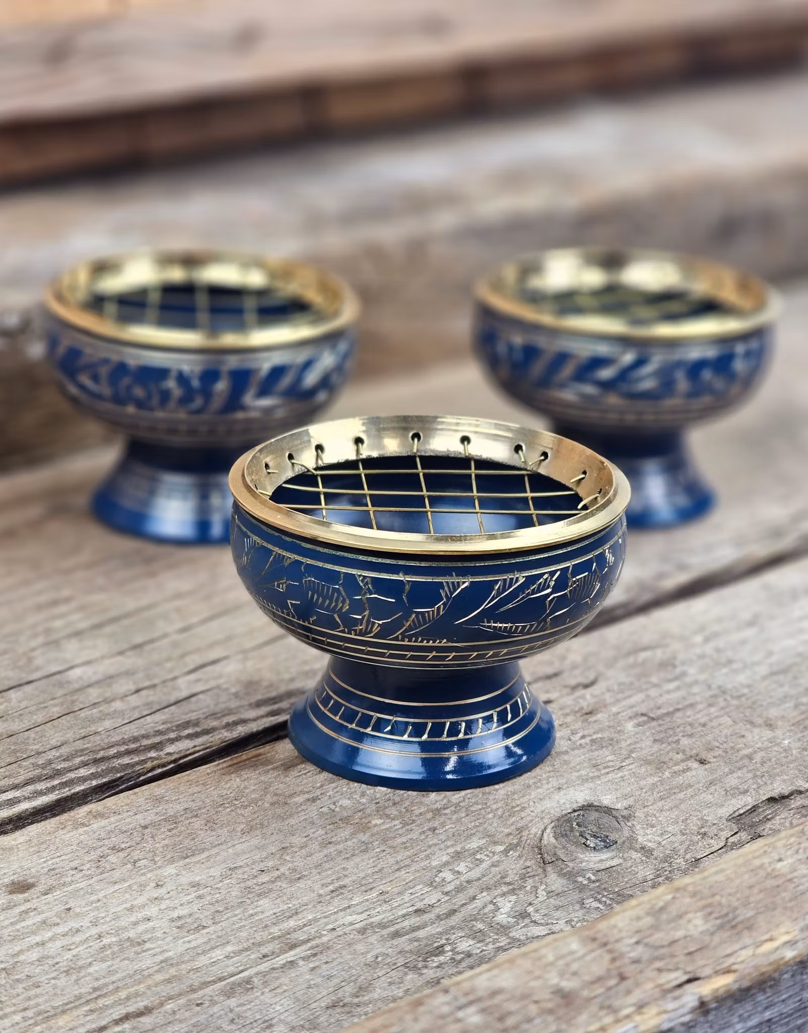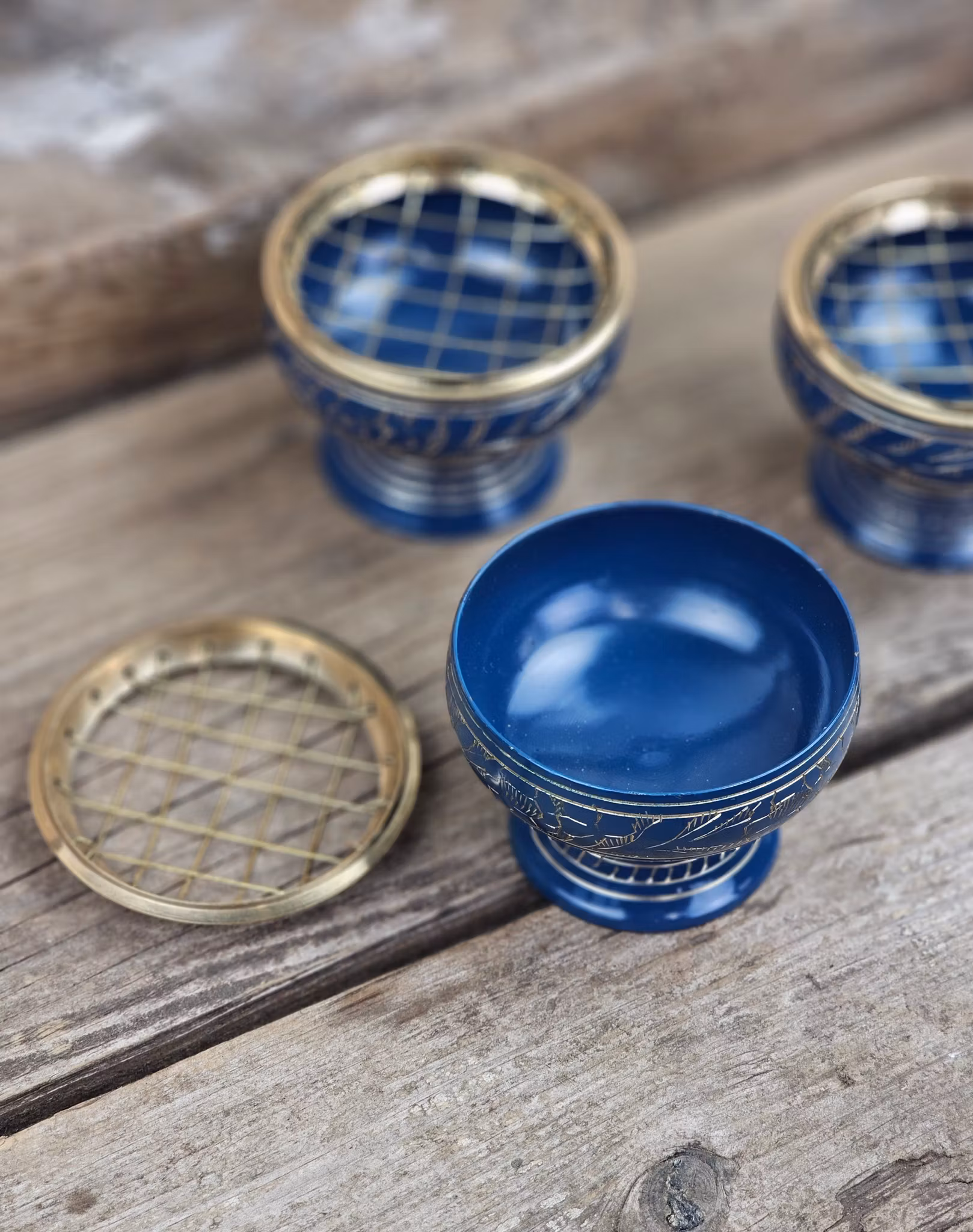 Mycket fin rökelsebrännare i mässing. Ett underbart tillskott till ditt altare. Dessa rökelsehållare är anpassade för flera ändamål; antingen för att bränna kol ihop med smudge resin ovanpå nätet, bränna t.ex. salvia i eller lägga sand i botten och ställa en rökelsekon eller vanliga rökelsepinnar i, då kan du dessutom bränna flera pinnar på samma gång. Denna rökelsehållare finns tillgänglig i flera olika färger hos oss. Här köper du i färgen marinblå. Tänk på att rökelsebrännaren blir varm, placeras på en värmetålig plats. Lämna aldrig tända rökelser obevakade. Håll utom räckhåll från barn och djur. Ventilera väl, ha gärna ett fönster öppet när du använder dig av rökelser så att röken kan ta sig ut. Rengörs med fuktad trasa och mild såpa, produkten tål ej maskindisk eller mikrovågsugn. Säljes styckvis. Rökelser ingår ej, köpes separat i vår butik. Färger kan skilja sig beroende på hur ljuset faller ner på produkten samt även mellan olika bildskärmar m.m.