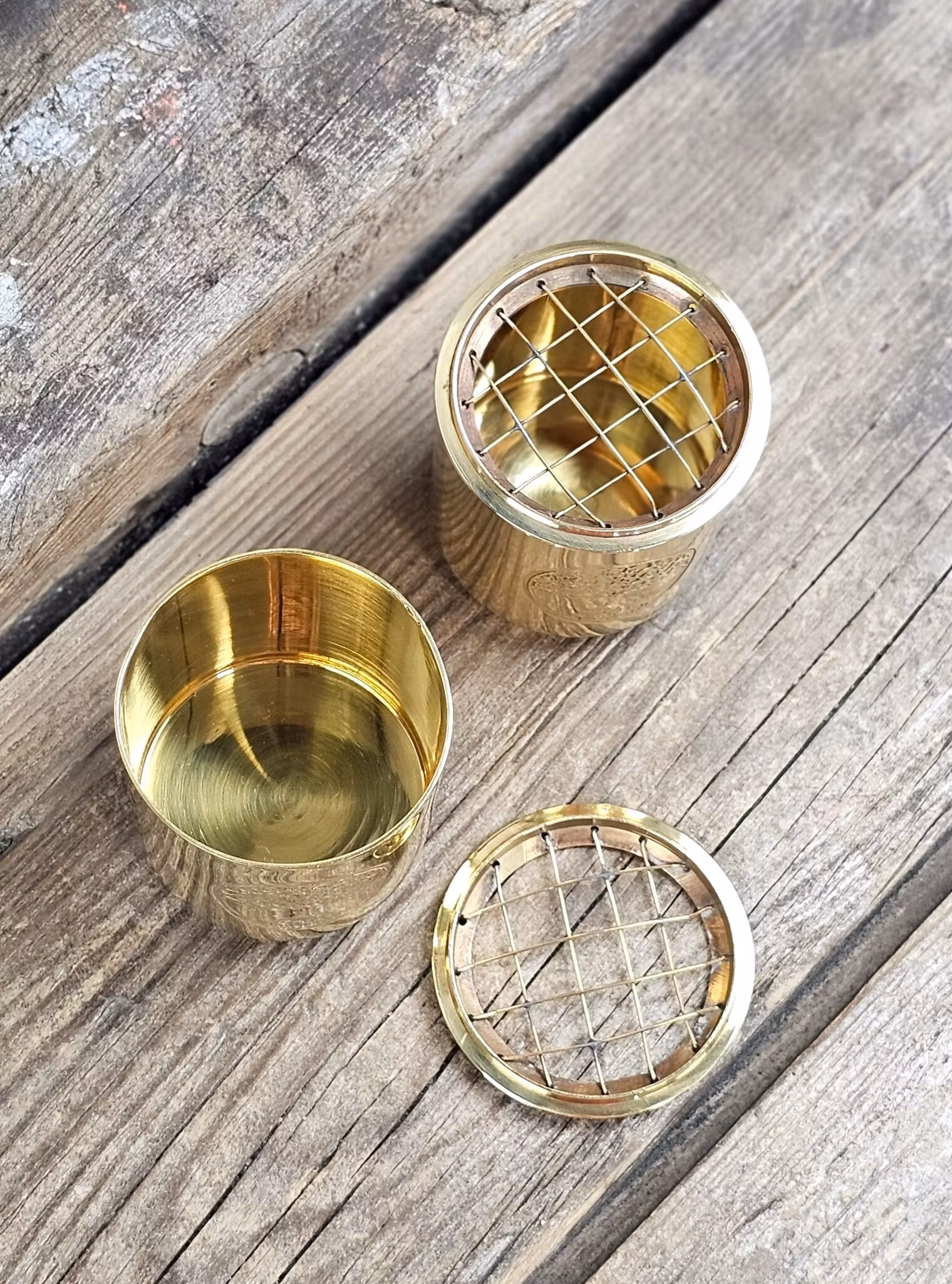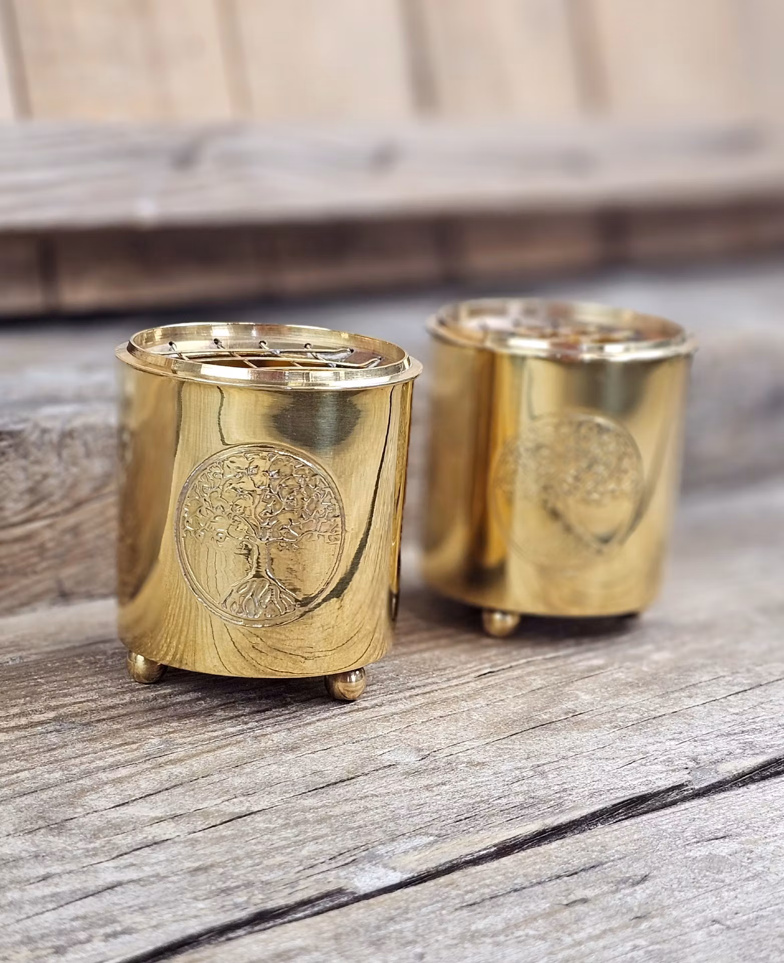 En vacker liten rökelsebrännare i mässing med dekor Tree Of Life framtill. Dessa rökelsehållare är anpassade för flera ändamål; antingen för att bränna kol ihop med smudge resin ovanpå nätet, bränna t.ex. salvia i eller lägga sand i botten och ställa en rökelsekon eller vanliga rökelsepinnar i, då kan du dessutom bränna flera pinnar på samma gång. Tänk på att rökelsebrännaren blir varm, placeras på en värmetålig plats. Lämna aldrig tända rökelser obevakade. Håll utom räckhåll från barn och djur. Ventilera väl, ha gärna ett fönster öppet när du använder dig av rökelser så att röken kan ta sig ut. Rengörs med fuktad trasa och mild såpa, produkten tål ej maskindisk eller mikrovågsugn. Säljes styckvis. Rökelser ingår ej, köpes separat i vår butik. Färger kan skilja sig beroende på hur ljuset faller ner på produkten samt även mellan olika bildskärmar m.m.