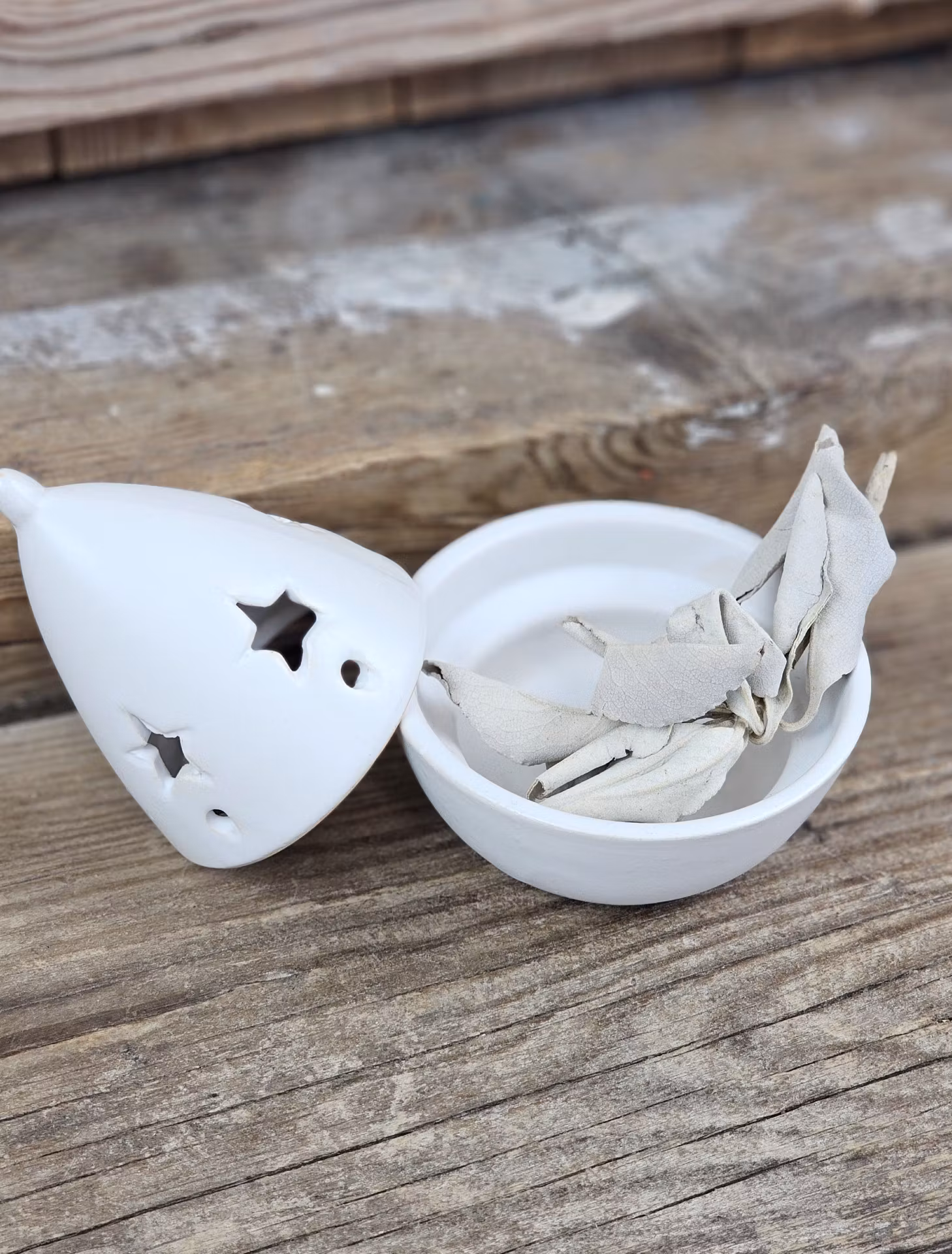 Mycket fin rökelsebrännare i keramik. För att t.ex. bränna koner i utan backflow-effekt eller för lös salvia eller smudge resin. Säljes styckvis. Rökelser ingår ej, dessa köpes separat. Du köper slumpvis liknande rökelsebrännare enligt text & bild ovan. Tänk på att små skillnader kan förekomma. Färger kan skilja sig beroende på hur ljuset faller ner på produkten samt även mellan olika bildskärmar m.m.
