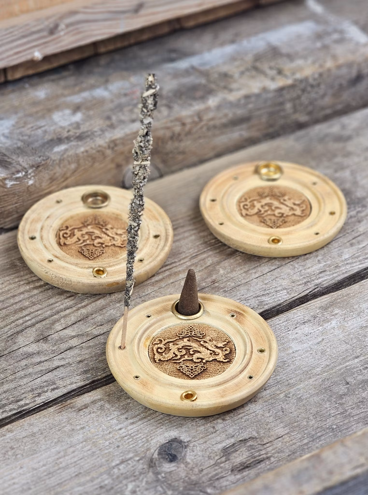 Fin rökelsehållare i trä med en drake på. Drakar symboliserar övernaturlig kraft, visdom, styrka och dold kunskap. Denna modell har flera borrade hål för att använda flera rökelsepinnar, du kan ha upp till 7 stycken rökelsepinnar på samma gång varav ett hål är extra brett samt även en plats för en rökelsekon. Placeras på en värmetålig plats. Lämna aldrig tända rökelser obevakade. Håll utom räckhåll från barn och djur. Ventilera väl, ha gärna ett fönster öppet när du använder dig av rökelser så att röken kan ta sig ut. Rengörs med fuktad trasa och mild såpa, produkten tål ej maskindisk eller mikrovågsugn. Säljes styckvis. Du köper en rökelsehållare enligt text & bild ovan. Naturmaterial, små skillnader kan förekomma i produkten. Färger kan skilja sig beroende på hur ljuset faller ner på produkten samt även mellan olika bildskärmar m.m.