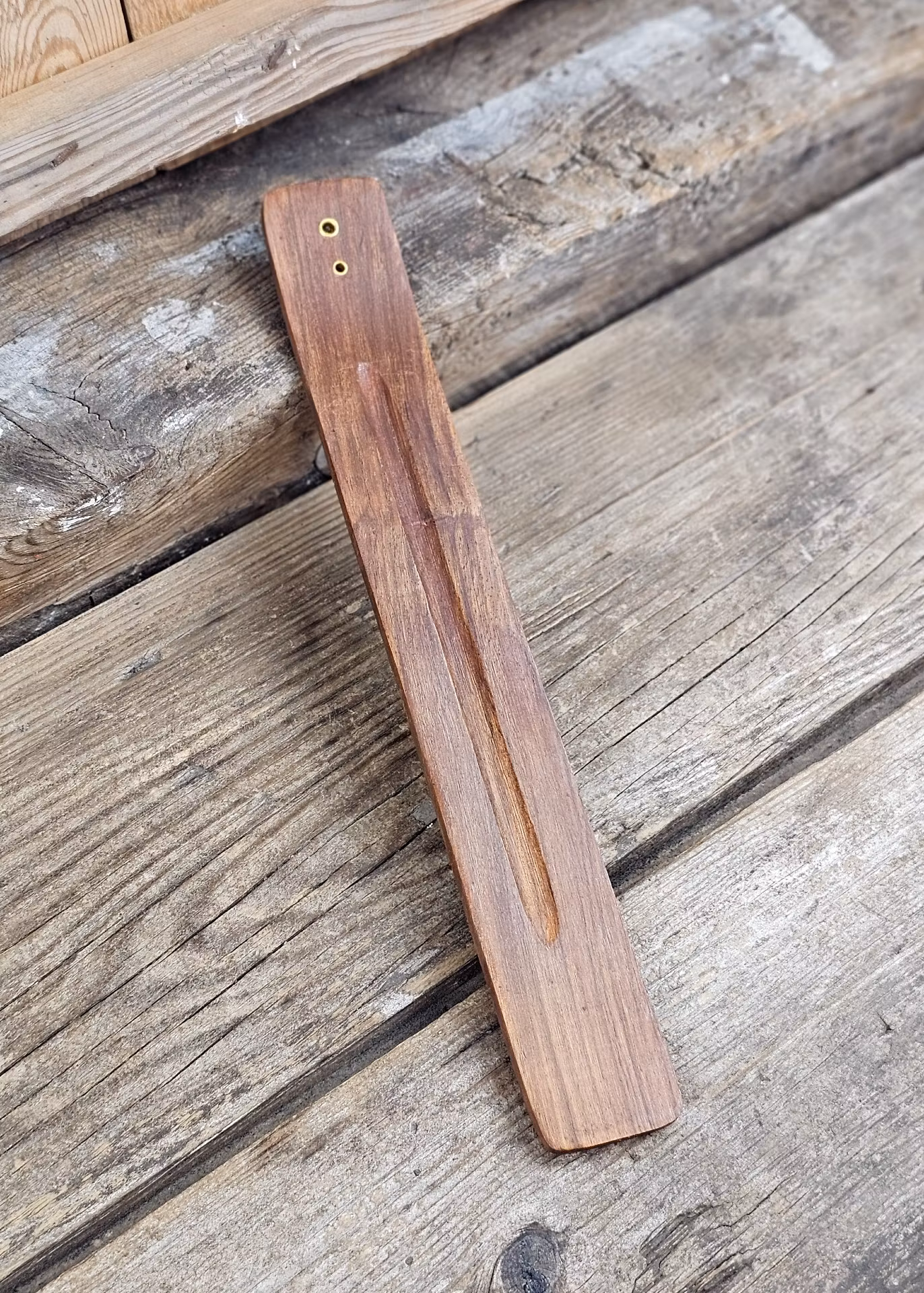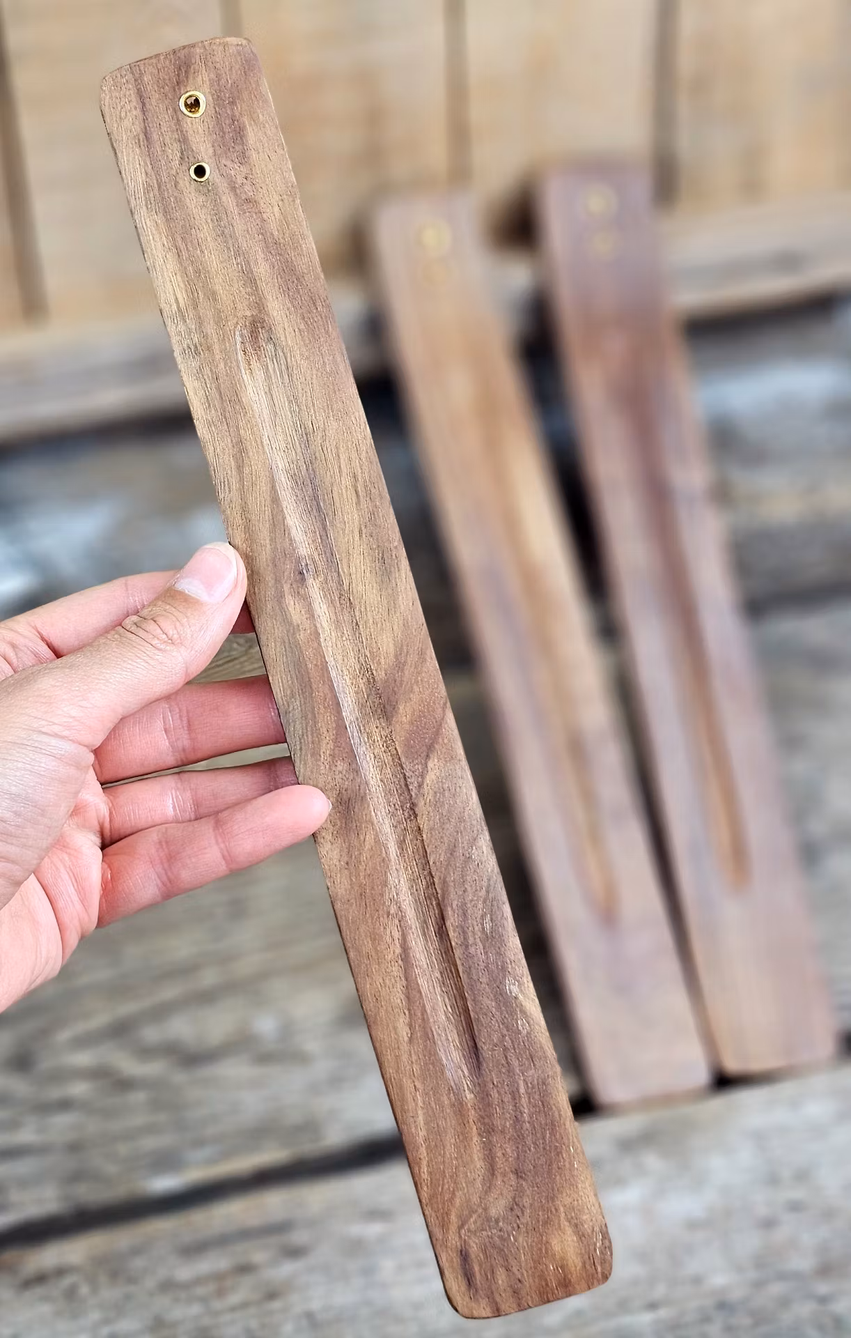 Mycket vacker rökelsehållare i mangoträ. Dessa har två borrade hål som hållare för rökelsepinnar med fin detalj vid hålet med mässing runt om. Väldigt fin kvalité. Säljes styckvis. Rökelser ingår ej, dessa köpes separat. De skiftar i utseende. Du köper slumpvis liknande rökelsehållare enligt text & bild ovan. Ojämnhet i form och färg kan förekomma. Färger kan skilja sig beroende på hur ljuset faller ner på produkten samt även mellan olika bildskärmar m.m.