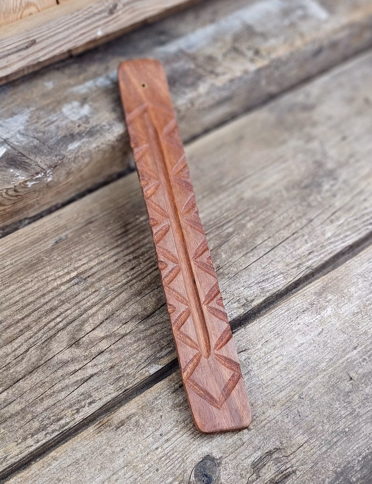Mycket vacker rökelsehållare i mangoträ med fina utskurna detaljer på sidorna. Dessa har ett borrat hål som hållare för rökelsepinne med mässing runt. Väldigt fin kvalité. Säljes styckvis. Rökelser ingår ej, dessa köpes separat. De skiftar i utseende. Du köper slumpvis liknande rökelsehållare enligt text & bild ovan. Ojämnhet i form och färg kan förekomma. Färger kan skilja sig beroende på hur ljuset faller ner på produkten samt även mellan olika bildskärmar m.m.