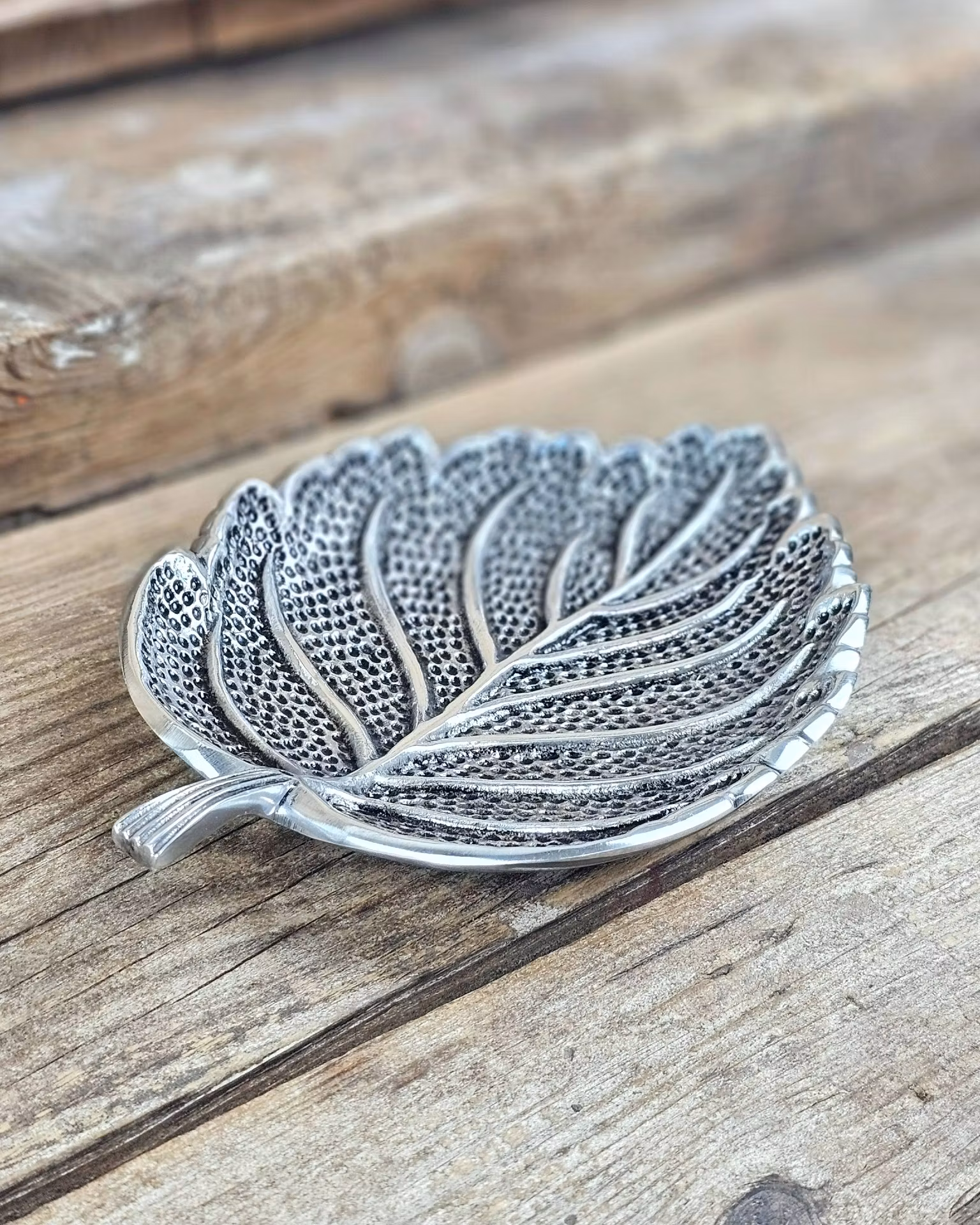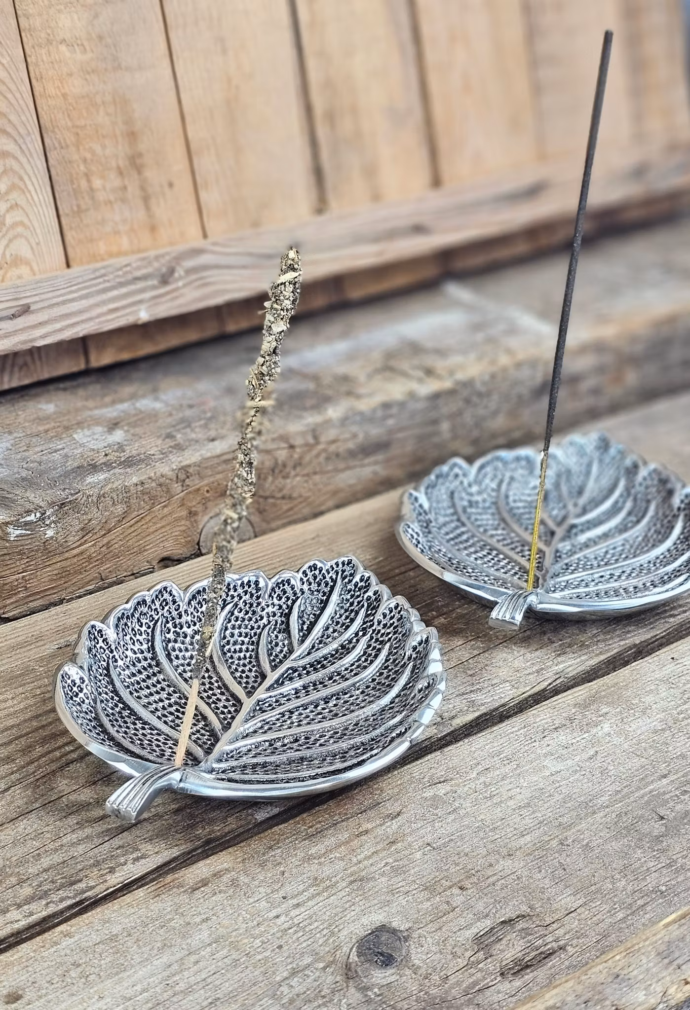 En elegant stor rökelsehållare i metall med mycket vacker form av ett stort blad. För rökelsepinnar. Tack vare bredden fångar den upp all aska från rökelser och är mycket lätt att rengöra. Placeras på en värmetålig plats. Lämna aldrig tända rökelser obevakade. Håll utom räckhåll från barn och djur. Ventilera väl, ha gärna ett fönster öppet när du använder dig av rökelser så att röken kan ta sig ut. Säljes styckvis. Rökelser ingår ej, köpes separat i vår butik. Rengörs med fuktad trasa och mild såpa, produkten tål ej maskindisk eller mikrovågsugn. Du köper en rökelsehållare enligt text & bild ovan. Färger kan skilja sig beroende på hur ljuset faller ner på produkten samt även mellan olika bildskärmar m.m.