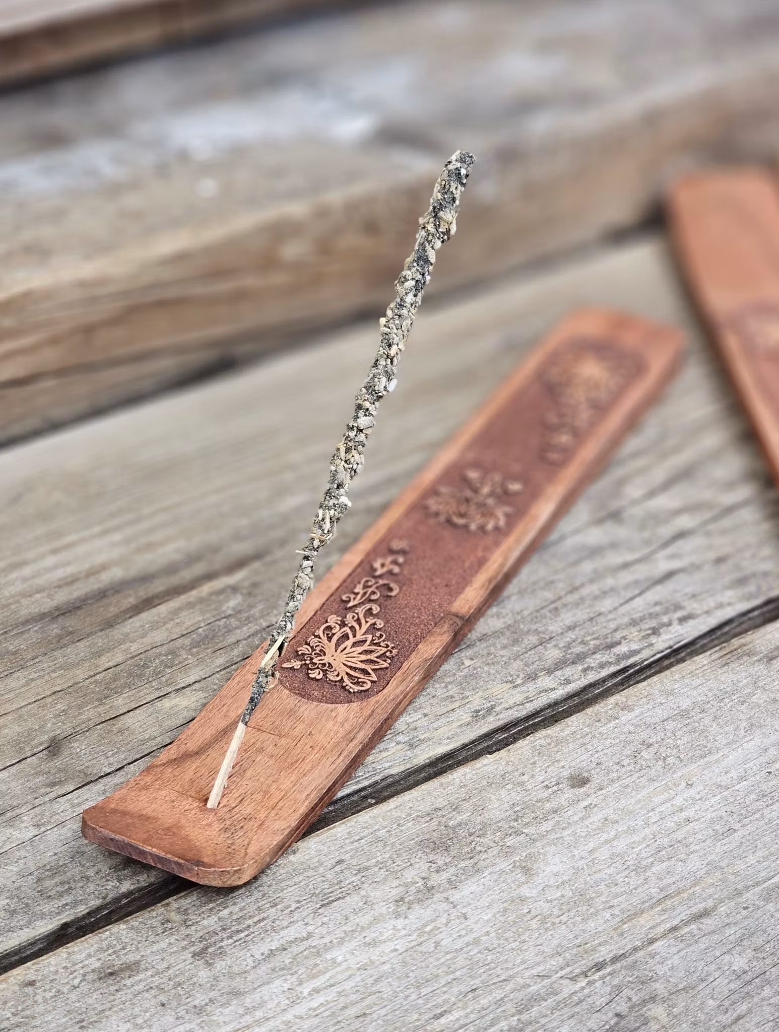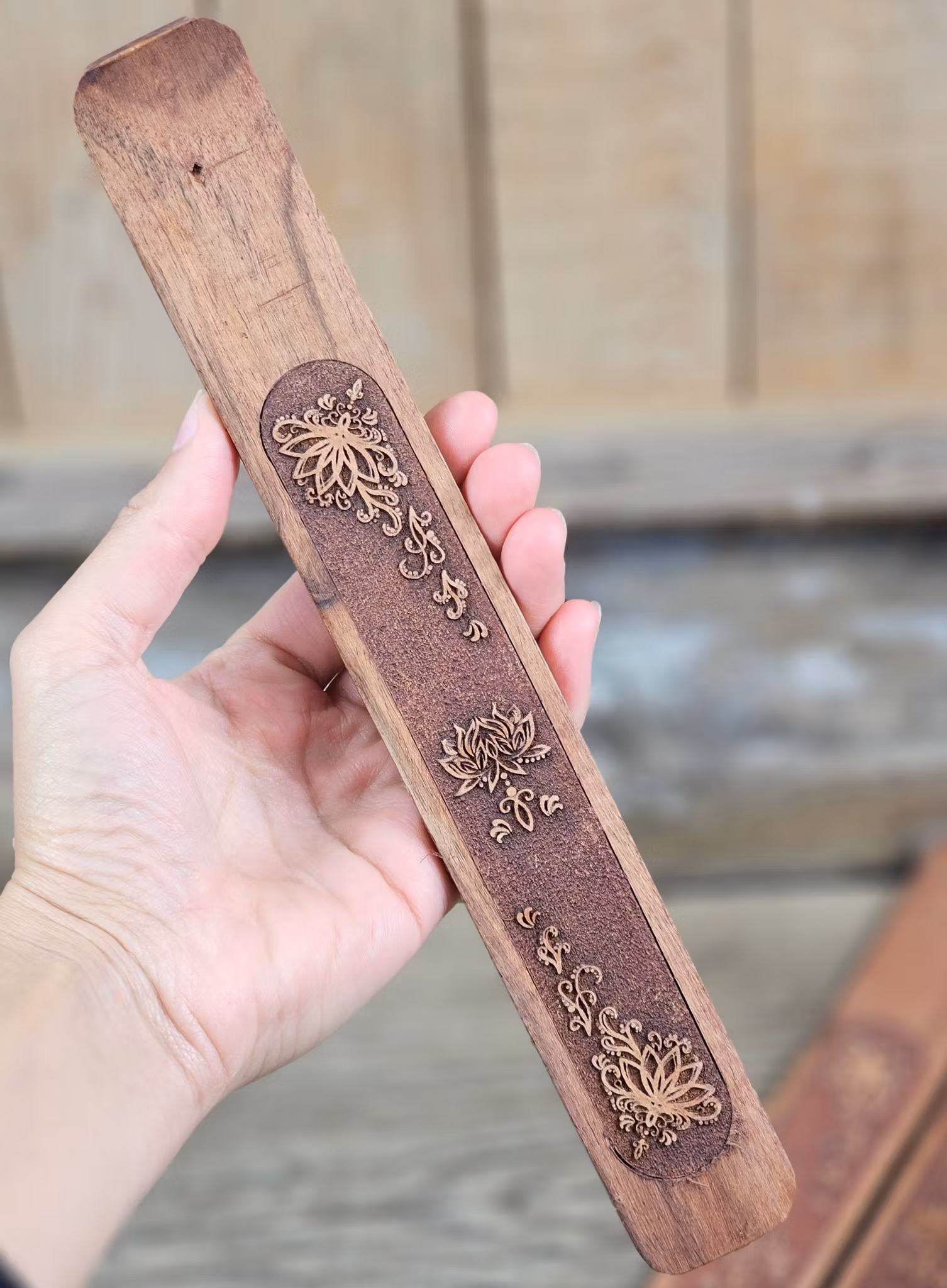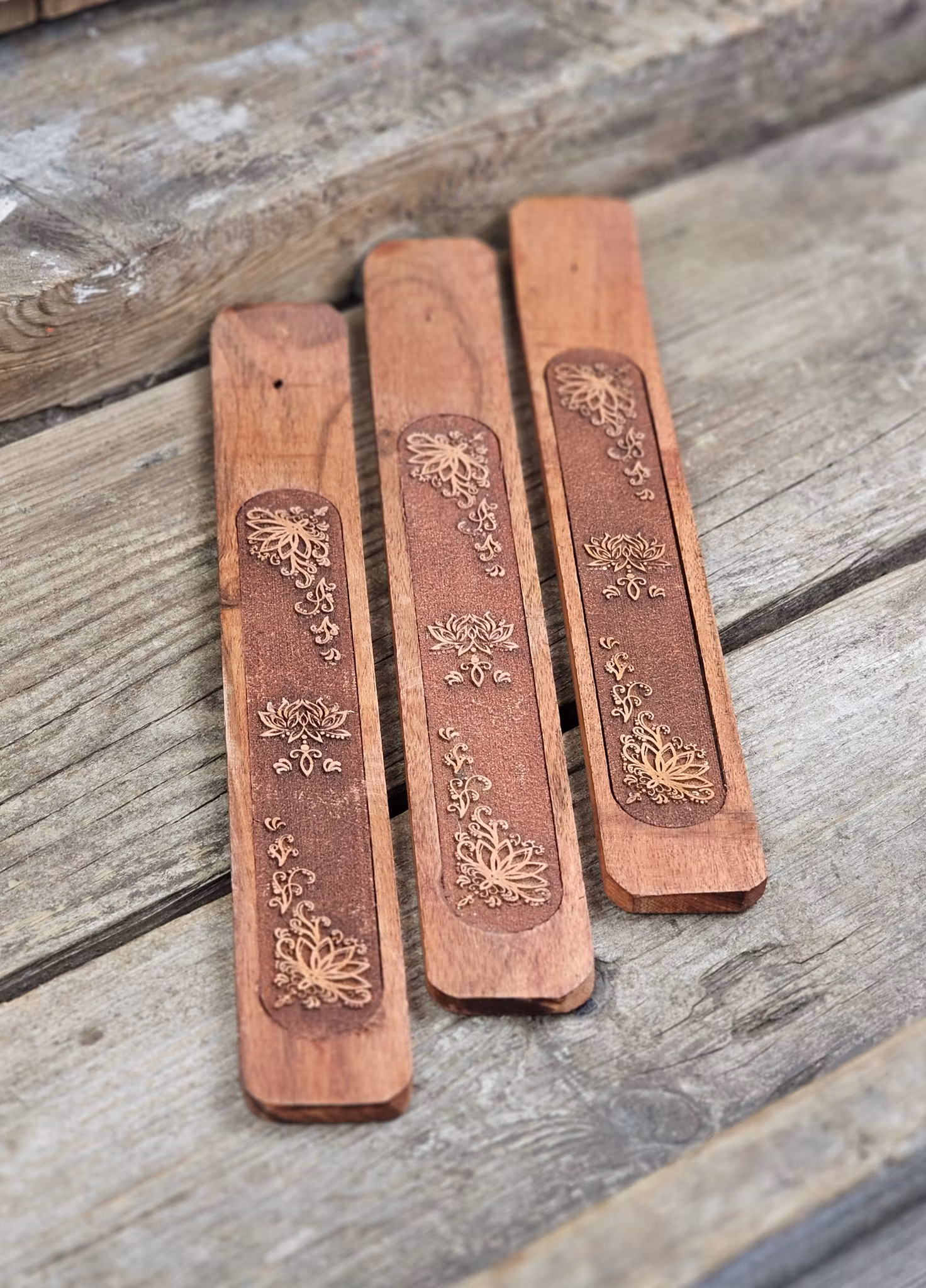 Mycket vackra rökelsehållare i trä med vacker Lotus-symbol på. Lotusblommans har en mängd olika betydelser i olika kulturer. I allmänhet ses dock lotus som en symbol för renhet, andlig upplysning och återfödelse. Det anses heligt i österländska kulturer. Dessa har ett borrat hål som hållare för rökelsepinnar. Väldigt rejäl och fin kvalité. Säljes styckvis. Rökelser ingår ej, dessa köpes separat. De skiftar i utseende. Du köper slumpvis liknande rökelsehållare enligt text & bild ovan. Ojämnhet i form och färg kan förekomma. Färger kan skilja sig beroende på hur ljuset faller ner på produkten samt även mellan olika bildskärmar m.m.