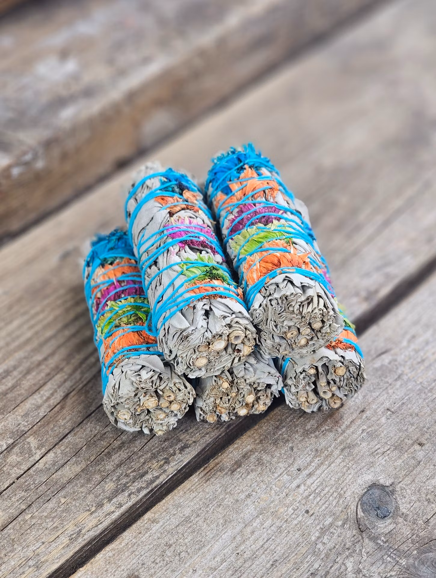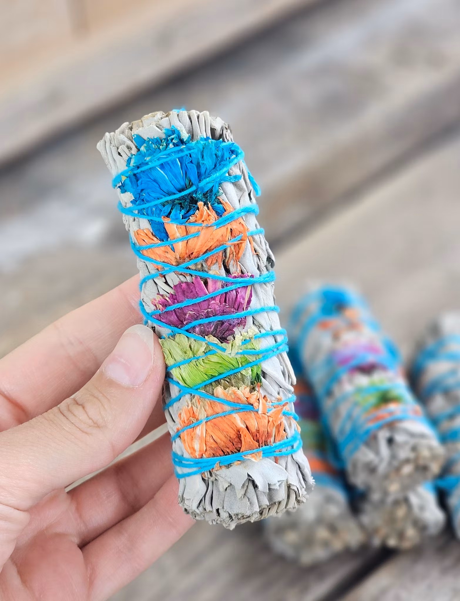 Rökelse av 100% naturlig äkta vit Salvia i en kombination med dekorativa blommor av Tusensköna (färgade). Tusensköna symboliserar glädje & vänskap, använd denna bunt när du vill föra in ny positiv energi och glädje! När du tänder din Salvia har röken en ganska intensiv men uppfriskande örtig doft. Används för att rena t.ex. dina kristaller eller ett rum och få bort stillastående/negativ energi. Jobba med din egen intuition. Perfekt att använda före en meditation. Röken från salvia sägs ha en renande, lugnande och balanserande effekt på oss människor. Salvia är en av de mest använda medicinalväxterna bland urinvånarna i Nord- och Sydamerika och används i ”smudge” ritualer där röken sägs utgöra en barriär för negativa energier och andar. Vit Salvia växer främst i Mexiko och i Kalifornien.