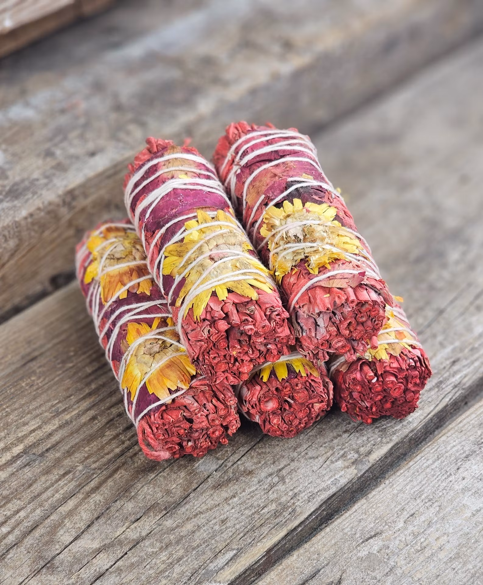 Rökelse av 100% naturlig äkta vit Salvia i en kombination med Dragon’s Blood resin från Croton Draco-trädet i Mexiko (Drakblodsträdet), torkade rosenblad och solros (1-2 styck Solrosor på varje bunt). Solros bidrar med ljus och upplyftande glädje till alla ritualer, vilket gör det till ett utmärkt val för att framkalla lycka och optimism. Ros främjar kärlek till dig själv och andra, frid, lycka, självförtroende och passion. Rosendoft är starkt kopplat till hjärtchakrat. Dragon's Blood resin har använts sedan antiken som traditionell medicin i olika kulturer runt om i världen. Det är känt för sina antivirala, antibakteriella och svampdödande egenskaper. När du tänder din Salvia har röken en ganska intensiv men uppfriskande söt örtig doft. Används för att rena t.ex. dina kristaller eller ett rum och få bort stillastående/negativ energi. Jobba med din egen intuition. Perfekt att använda före en meditation. Röken från salvia sägs ha en renande, lugnande och balanserande effekt på oss människor. Salvia är en av de mest använda medicinalväxterna bland urinvånarna i Nord- och Sydamerika och används i ”smudge” ritualer där röken sägs utgöra en barriär för negativa energier och andar. Vit Salvia växer främst i Mexiko och i Kalifornien.