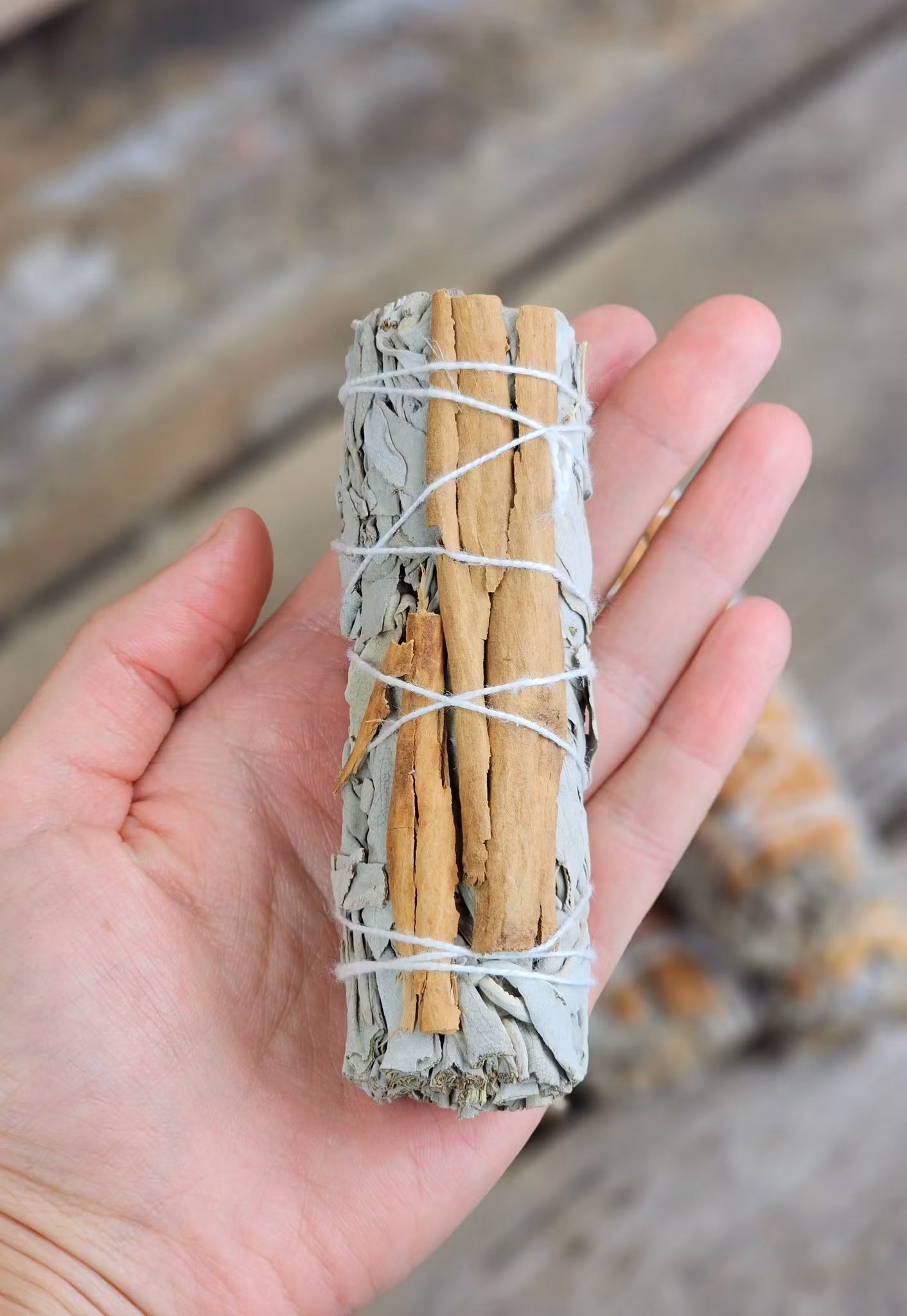 Rökelse av 100% naturlig äkta vit Salvia i en kombination med Kanel. Kanel tillför inre styrka, mod och beskydd. När du tänder din Salvia har röken en ganska intensiv men uppfriskande örtig doft. Används för att rena t.ex. dina kristaller eller ett rum och få bort stillastående/negativ energi. Jobba med din egen intuition. Perfekt att använda före en meditation. Röken från salvia sägs ha en renande, lugnande och balanserande effekt på oss människor. Salvia är en av de mest använda medicinalväxterna bland urinvånarna i Nord- och Sydamerika och används i ”smudge” ritualer där röken sägs utgöra en barriär för negativa energier och andar. Vit Salvia växer främst i Mexiko och i Kalifornien.
