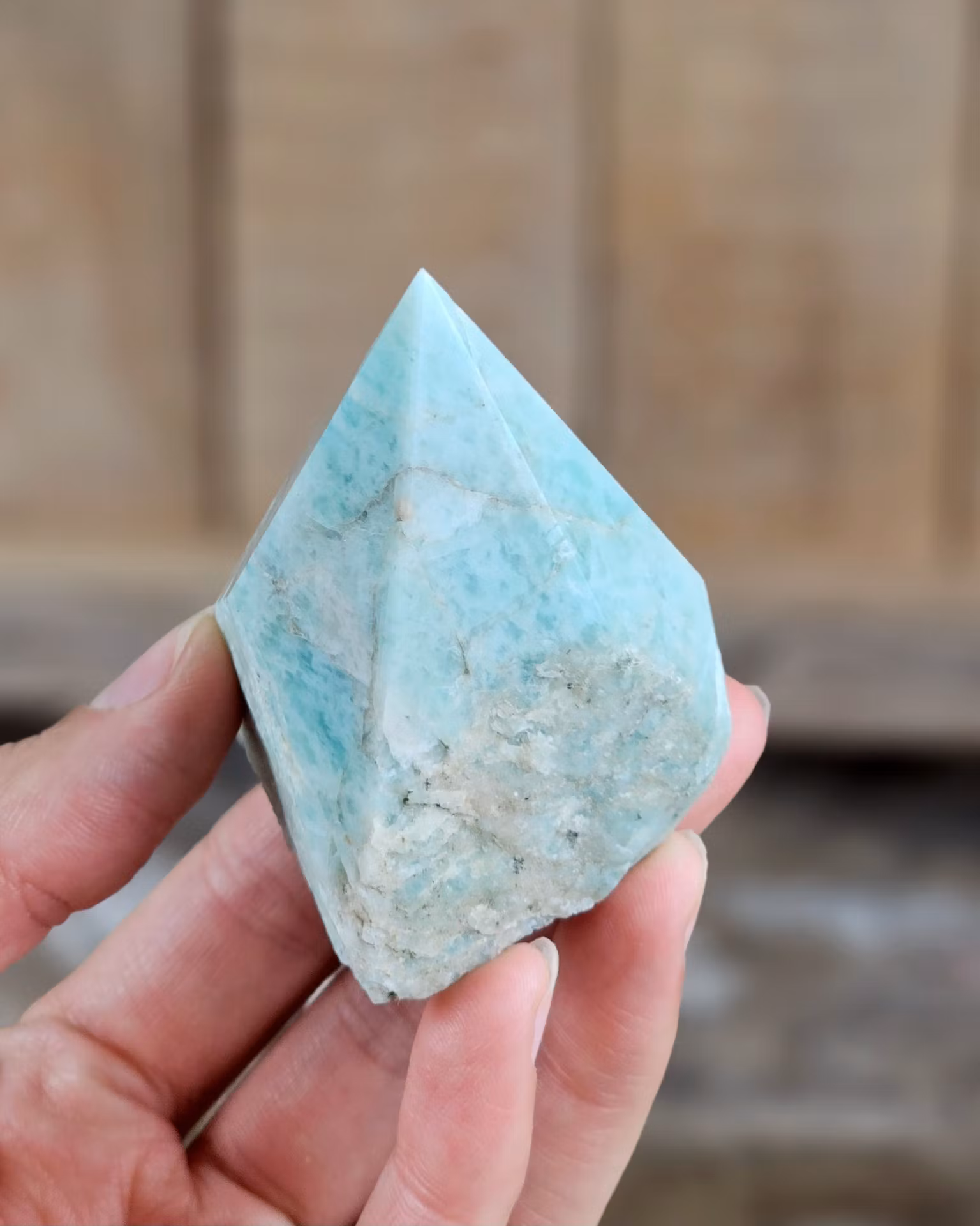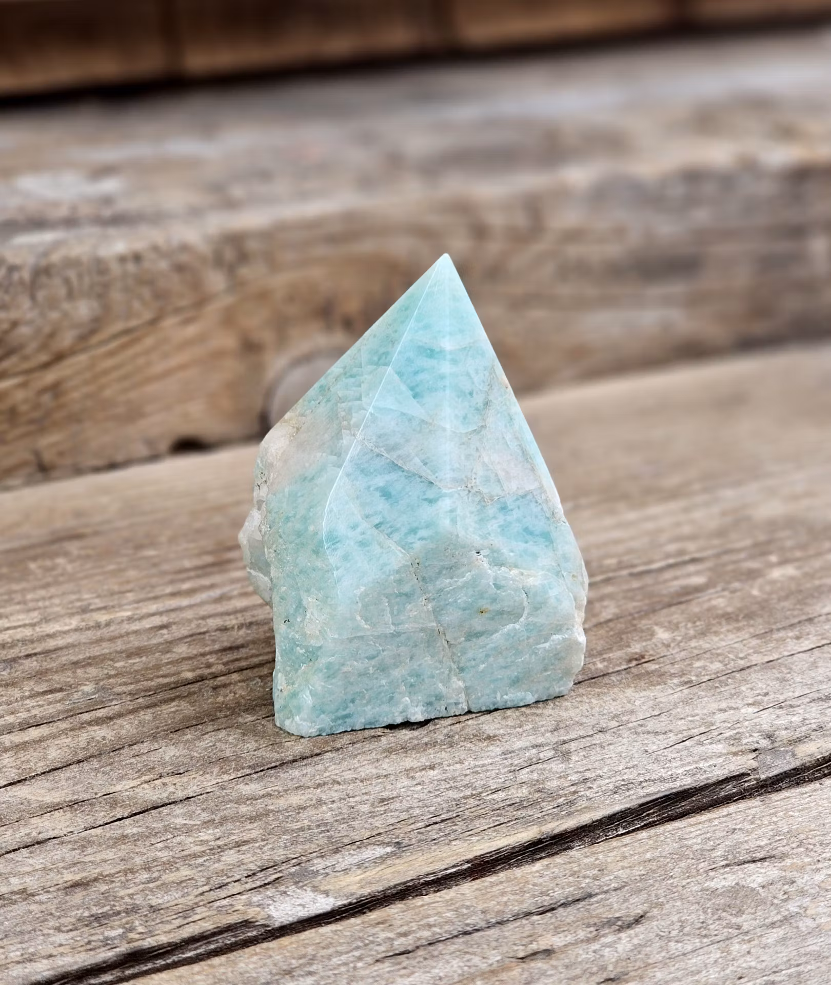 Mycket fin stående polerad spets i Amazonit. Råa sidor och slipad botten. Superhärligt exemplar med riktigt läcker färg! Tänk på att kristaller kommer från naturen & naturliga sprickor & ojämnhet kan förekomma. Färger kan skilja sig beroende på hur ljuset faller ner på kristallen samt även mellan olika bildskärmar m.m.