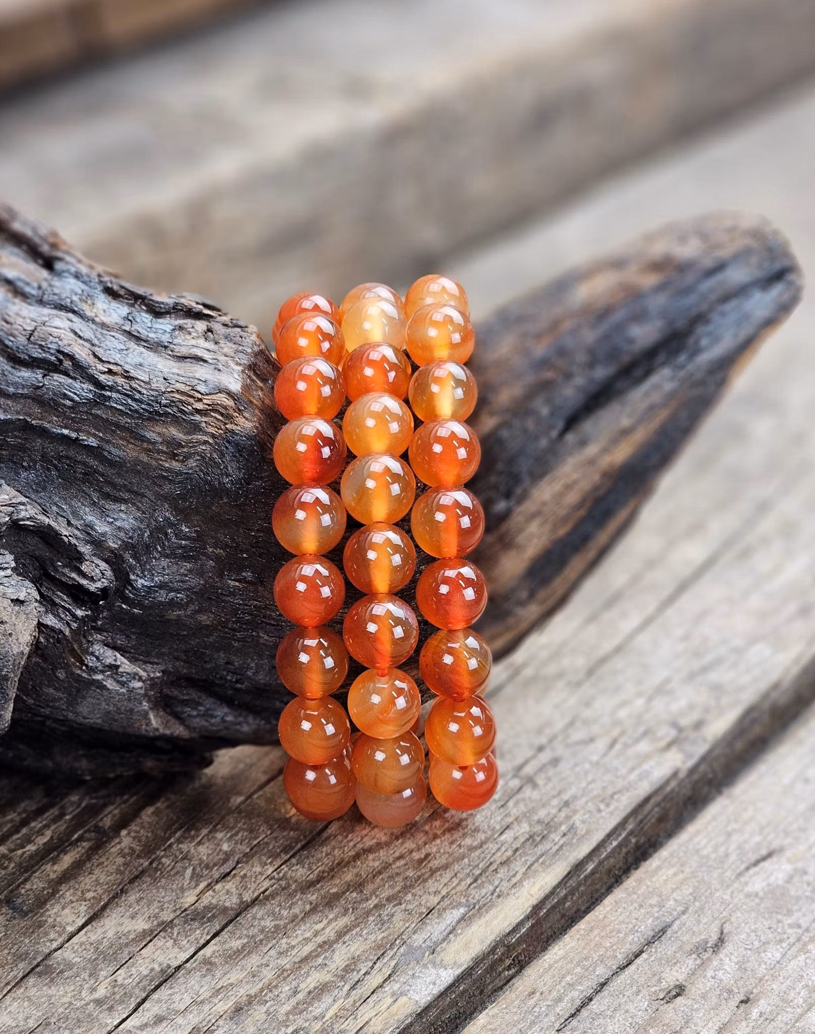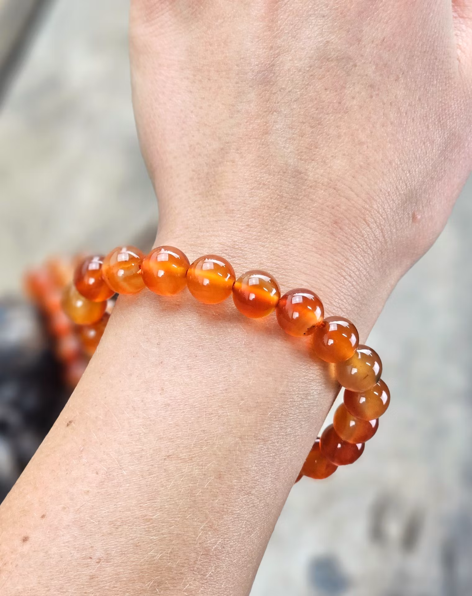 Mycket vackert elastiskt armband i Karneol. Riktigt snygg och stilren modell som är mycket fin att ha bara en runt handleden eller flera tillsammans. Säljes styckvis. Du köper ett smycke enligt text & bild ovan. Tänk på att kristaller kommer från naturen & därför varierar i utseende, varje exemplar är unikt. Färger kan skilja sig beroende på hur ljuset faller ner på kristallen samt även mellan olika bildskärmar m.m.