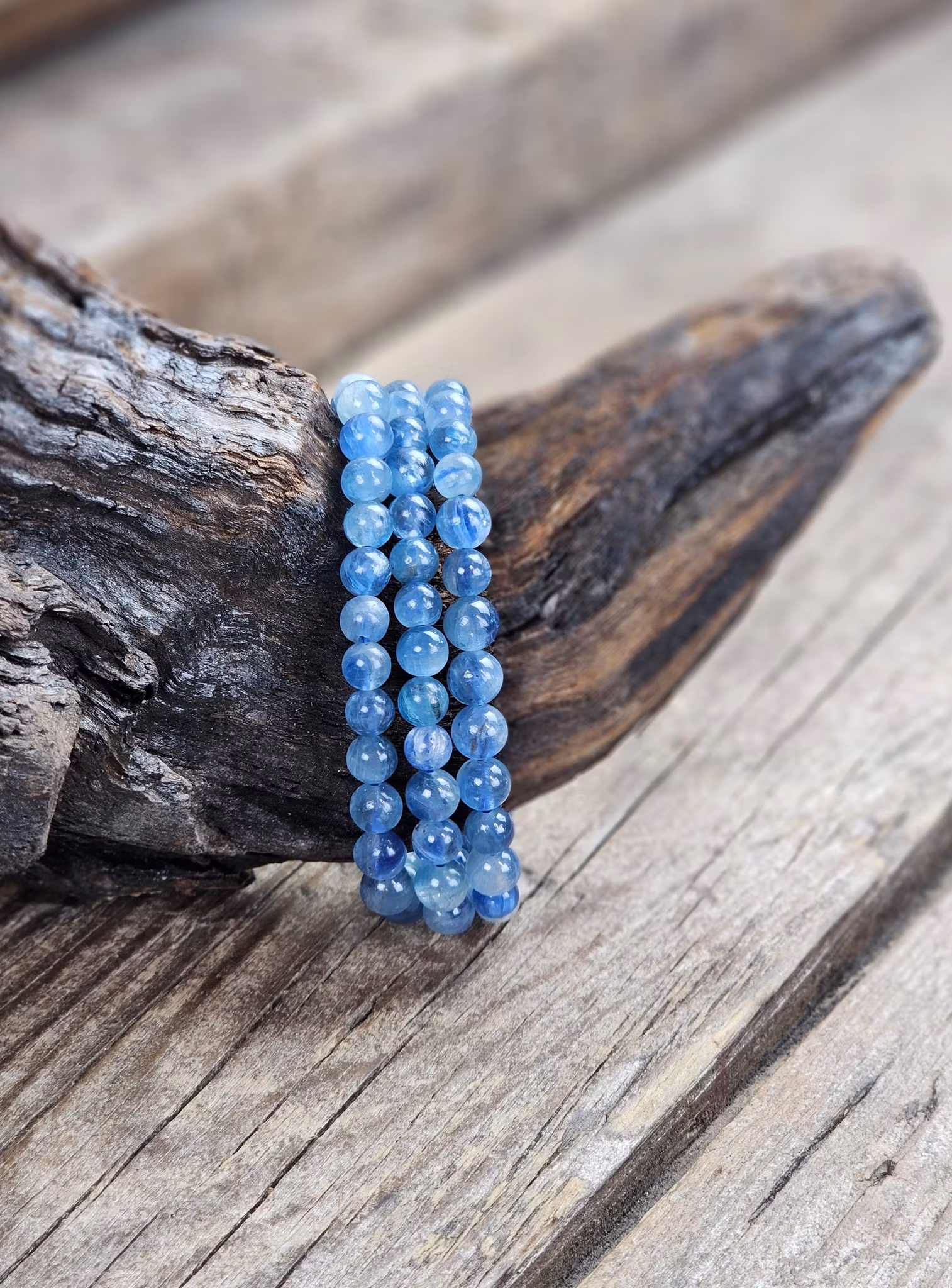 Mycket vackert elastiskt armband i helt underbar Blå Kyanit! Mycket hög kvalité med fin transparens och skimmer i. Väldigt nätt & stilren modell som är mycket fin att ha bara en runt handleden eller flera tillsammans. Säljes styckvis. Kyanit är en porös kristall, den är känslig för vatten och solljus. Du köper ett kristallsmycke enligt text & bild ovan. Tänk på att kristaller kommer från naturen, små skillnader kan därför förekomma i produktens utseende på grund av dess naturmaterial. Färger kan skilja sig beroende på hur ljuset faller ner på kristallen samt även mellan olika bildskärmar m.m.