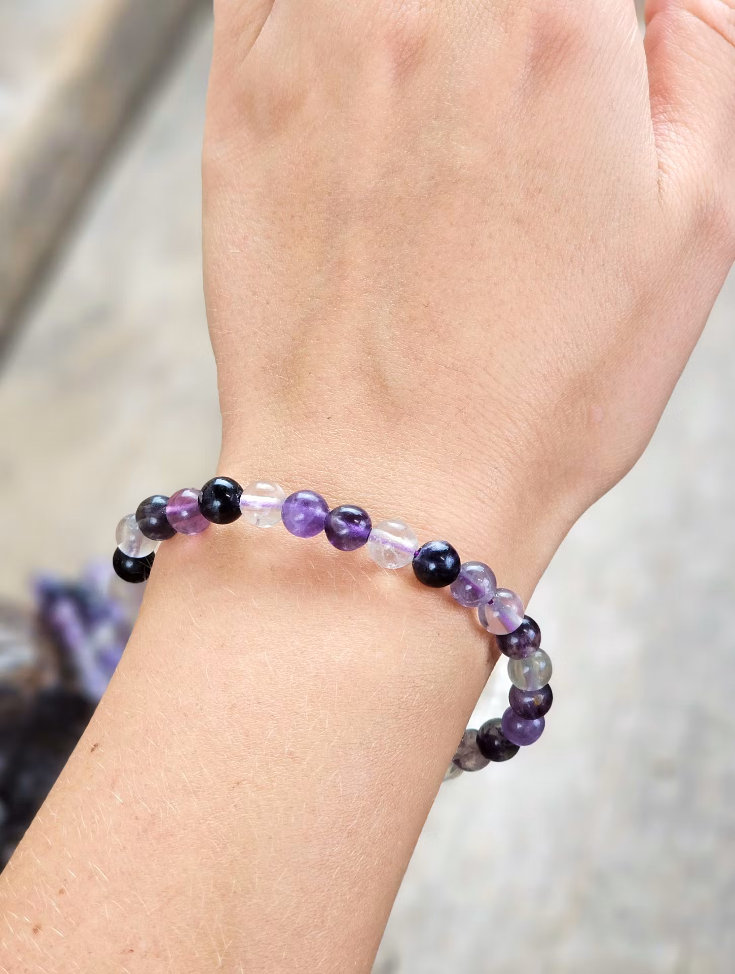 Mycket vackert elastiskt armband i Lila Fluorit. Väldigt nätt & stilren modell som är mycket fin att ha bara en runt handleden eller flera tillsammans. Säljes styckvis. De skiftar i utseende. Du köper ett smycke enligt text & bild ovan. Fluorit är ett mineral som innehåller kalciumfluorid och finns i en bred variation av färger. Dess naturliga form vid kristallisering är bland annat kubiska och oktaedriska kristaller, vilket är ett unikt utseende och karaktärsdrag för just Fluorit. En fantastiskt vacker kristall med otroligt vackra färger och färgkombinationer. Fluorit, även kallad flusspat, används även inom många olika industrier, bland annat som komponent i glastillverkning och som flussmedel vid tillverkning av stål. Det är ett vanligt förekommande mineral som återfinns på många platser, för att nämna några länder t.ex. Mexiko, Brasilien, Kina och Argentina. Fluorit förekommer som redan nämnt i en bred variation av färger, allt från färglös transparent till violetta toner, blått, turkos, grön, gul, brungul med mera. När Fluorit har en kombination av flera olika färger kallas den ofta för Regnbågsfluorit.