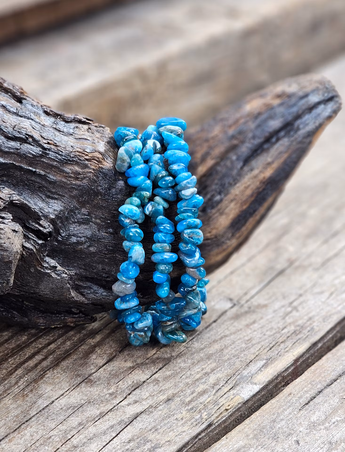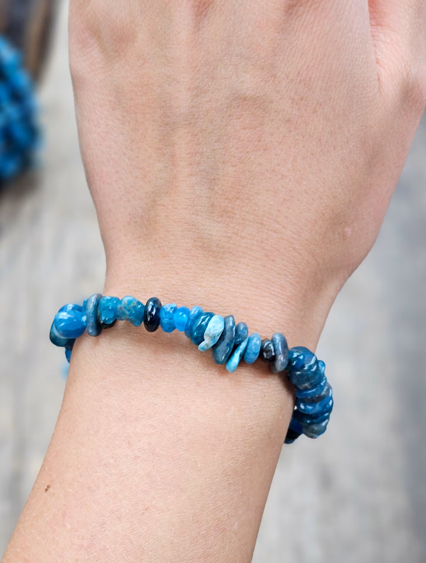 Mycket vackert elastiskt armband i Apatit med riktigt härlig färg. Väldigt nätt & stilren modell som är mycket fin att ha bara en runt handleden eller flera tillsammans. Säljes styckvis. Du köper slumpvis liknande smycke enligt text & bild ovan. Tänk på att kristaller kommer från naturen & naturliga sprickor & ojämnhet kan förekomma. Färger kan skilja sig beroende på hur ljuset faller ner på kristallen samt även mellan olika bildskärmar m.m.
