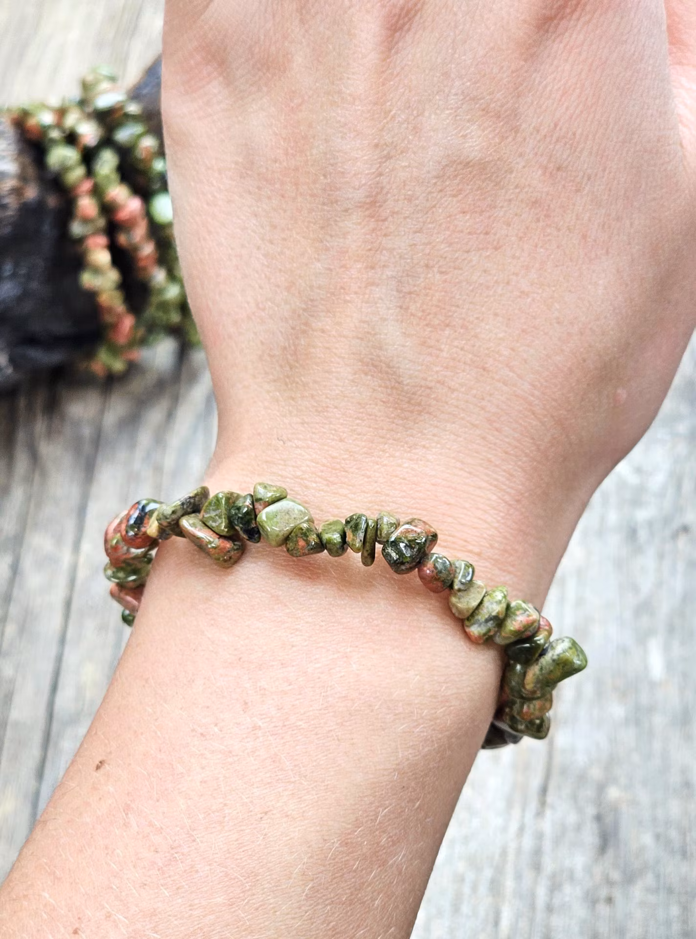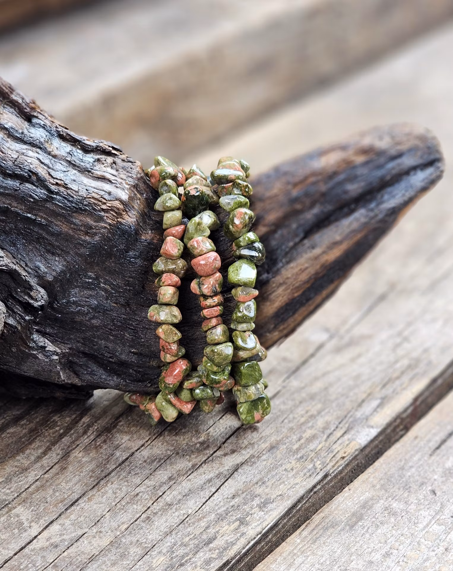 Mycket vackert elastiskt armband i Unakit. Väldigt nätt & stilren modell som är mycket fin att ha bara en runt handleden eller flera tillsammans. Säljes styckvis. Du köper slumpvis liknande smycke enligt text & bild ovan. Tänk på att kristaller kommer från naturen & naturliga sprickor & ojämnhet kan förekomma. Färger kan skilja sig beroende på hur ljuset faller ner på kristallen samt även mellan olika bildskärmar m.m.
