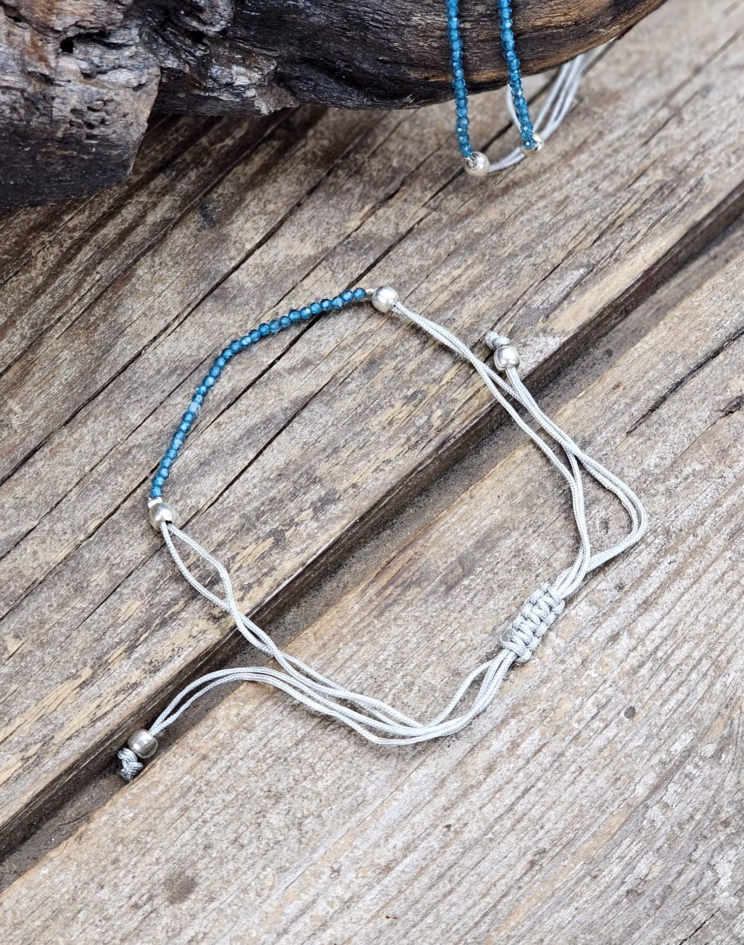 Otroligt vackert armband med en silverglänsande macramé-tråd kombinerat med glittrande facetterade pärlor i Blå Topas i en extra hög kvalité med mörk färg. Tack vare den enkla öppningsbara macramé-knuten så kan detta armband anpassas till vilken typ av handled som helst. Den passar även att använda som fotlänk. Pärlorna vid sidorna om knutarna på detta armband är i silverplätering. Väldigt nätt & stilren modell som är mycket fin att ha bara en runt handleden eller flera tillsammans. Säljes styckvis. Du köper slumpvis liknande smycke enligt text & bild ovan. Tänk på att kristaller kommer från naturen & naturliga sprickor & ojämnhet kan förekomma. Färger kan skilja sig beroende på hur ljuset faller ner på kristallen samt även mellan olika bildskärmar m.m.