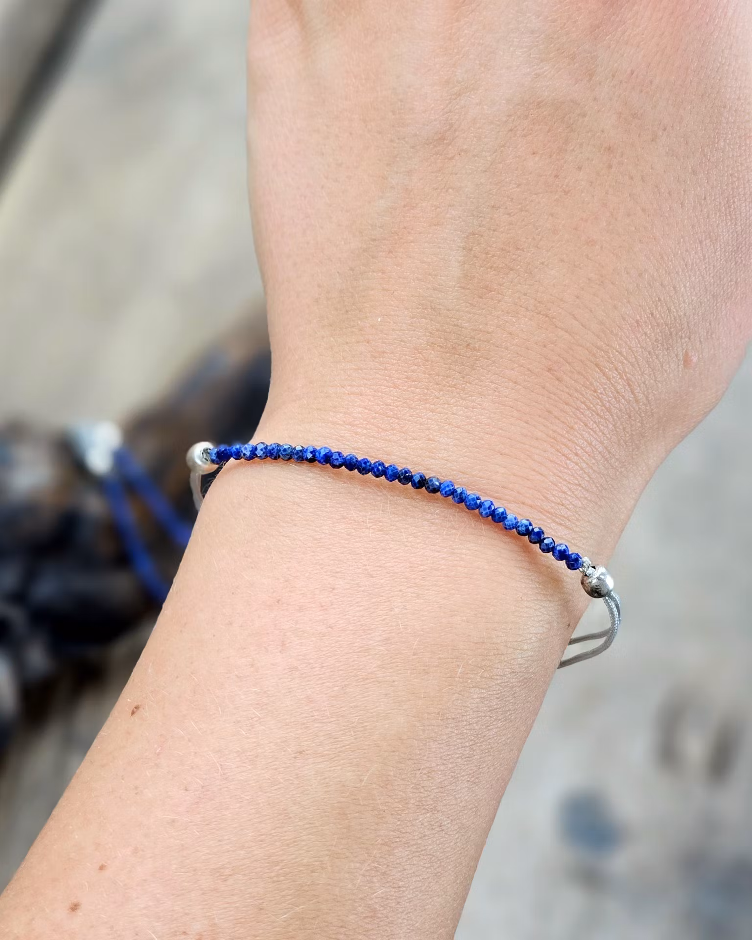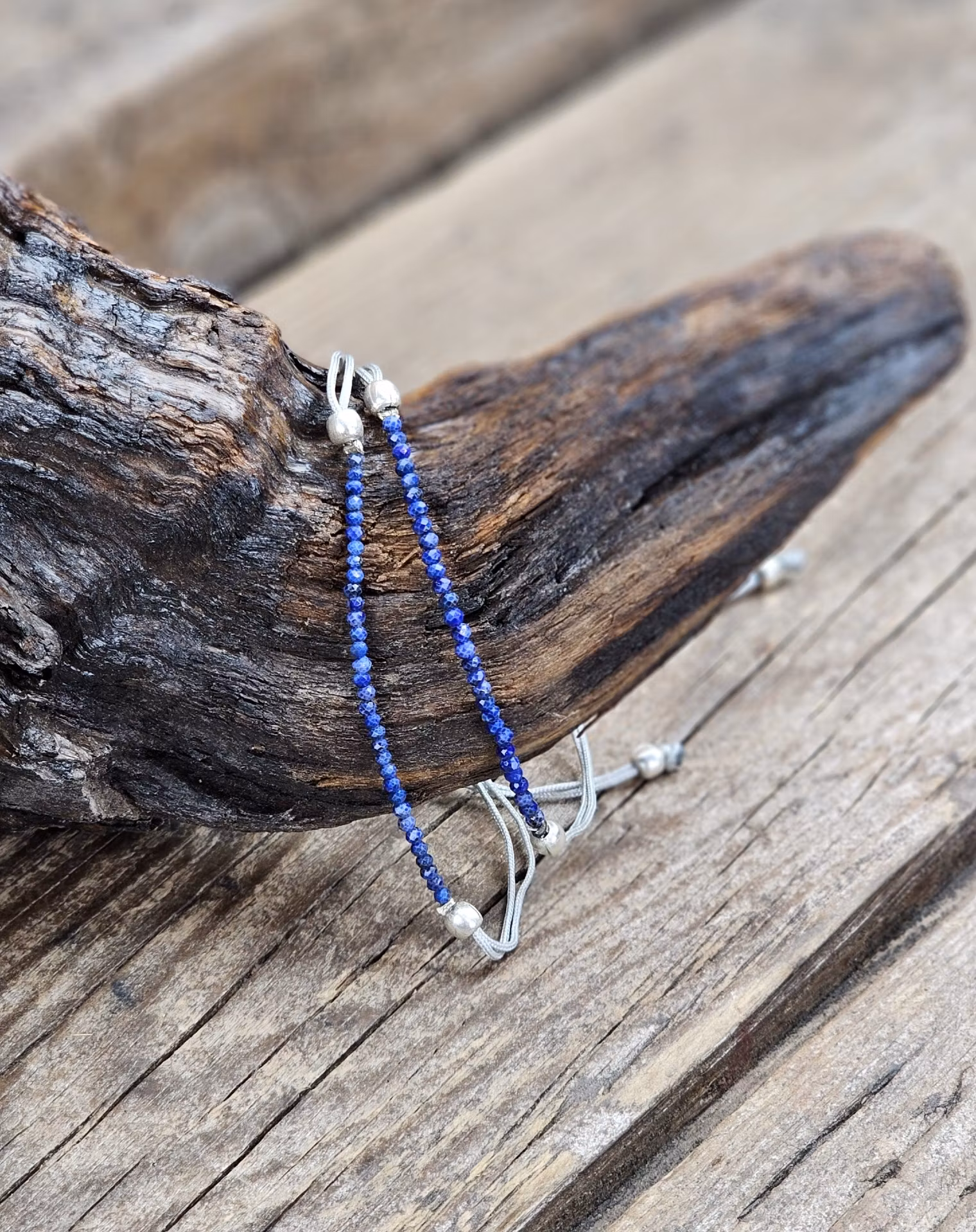 Otroligt vackert armband med en silverglänsande macramé-tråd kombinerat med glittrande facetterade pärlor i Lapis Lazuli. Tack vare den enkla öppningsbara macramé-knuten så kan detta armband anpassas till vilken typ av handled som helst. Den passar även att använda som fotlänk. Pärlorna vid sidorna om knutarna på detta armband är i silverplätering. Väldigt nätt & stilren modell som är mycket fin att ha bara en runt handleden eller flera tillsammans. Säljes styckvis. Du köper slumpvis liknande smycke enligt text & bild ovan. Tänk på att kristaller kommer från naturen & naturliga sprickor & ojämnhet kan förekomma. Färger kan skilja sig beroende på hur ljuset faller ner på kristallen samt även mellan olika bildskärmar m.m.