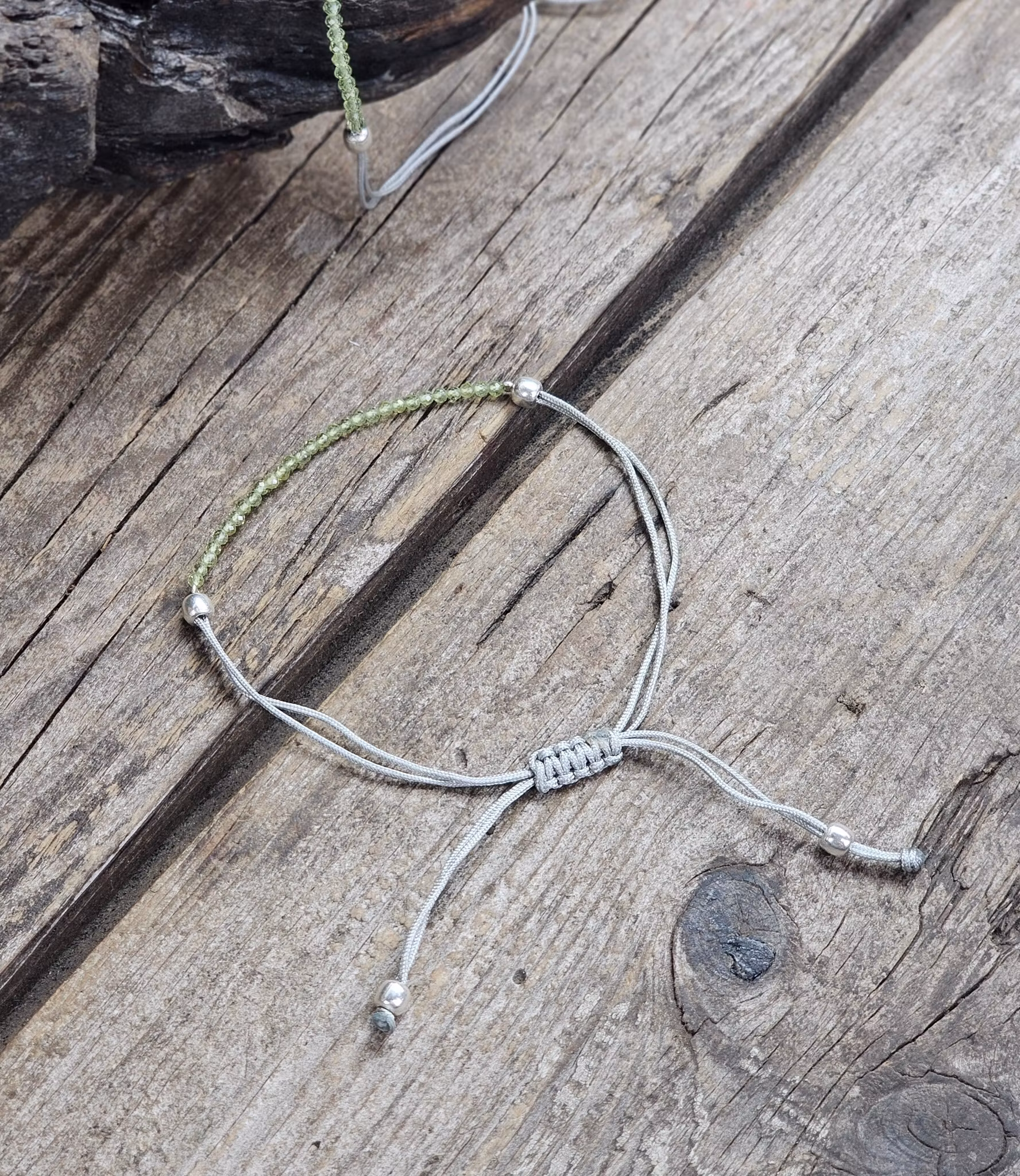 Otroligt vackert armband med en silverglänsande macramé-tråd kombinerat med glittrande facetterade pärlor i Peridot (Olivin). Tack vare den enkla öppningsbara macramé-knuten så kan detta armband anpassas till vilken typ av handled som helst. Den passar även att använda som fotlänk. Pärlorna vid sidorna om knutarna på detta armband är i silverplätering. Väldigt nätt & stilren modell som är mycket fin att ha bara en runt handleden eller flera tillsammans. Säljes styckvis. Du köper slumpvis liknande smycke enligt text & bild ovan. Tänk på att kristaller kommer från naturen & naturliga sprickor & ojämnhet kan förekomma. Färger kan skilja sig beroende på hur ljuset faller ner på kristallen samt även mellan olika bildskärmar m.m.
