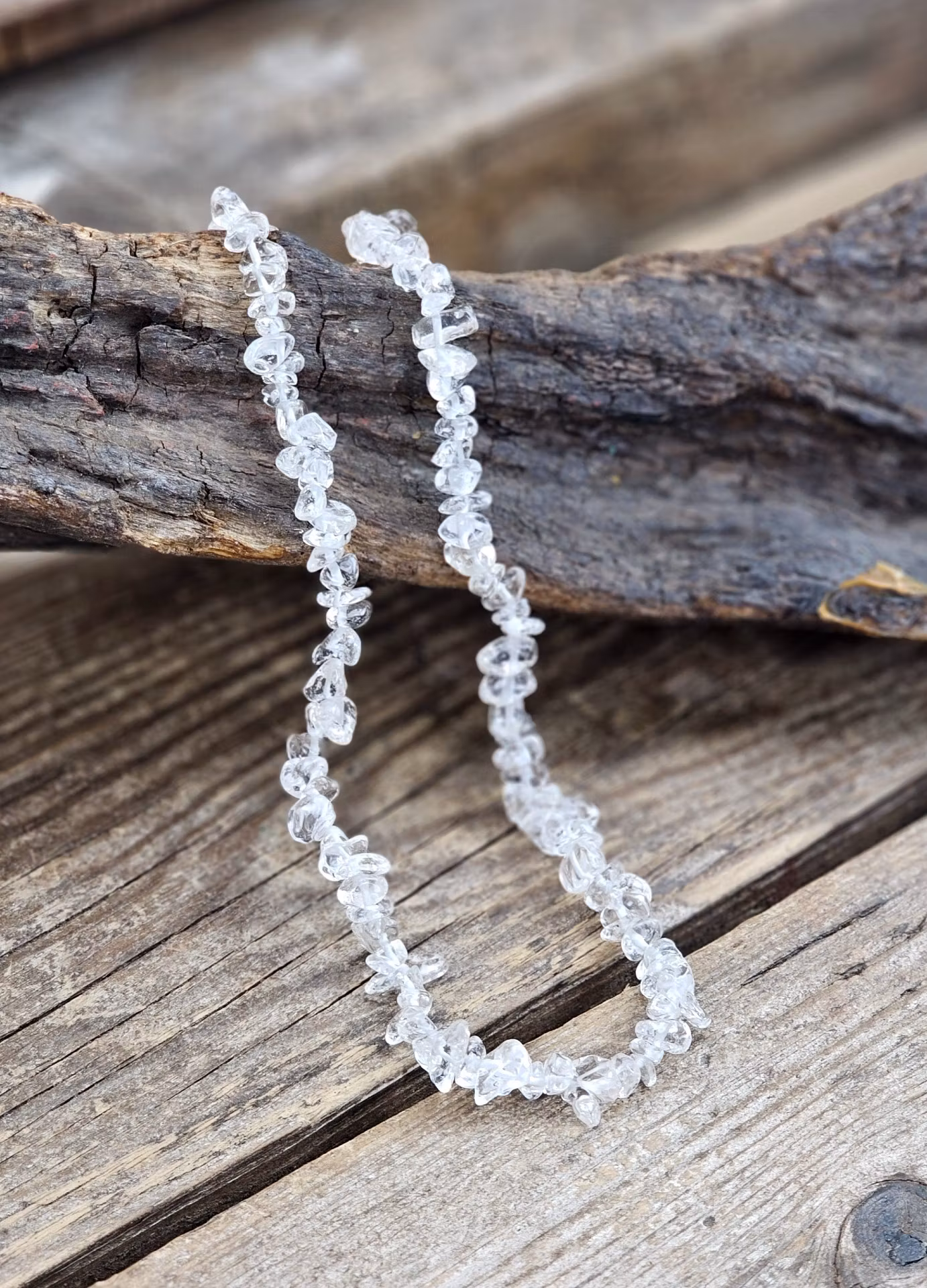 Vackert halsband, skapat med naturliga kristaller av Bergkristall i mjuka oregelbundna former. Denna subtila och iögonfallande design kompletterar perfekt våra chipsarmband som finns i vår webbshop, som delar samma modell av stenar. För ett komplett sett, matcha med våra chipsarmband här.