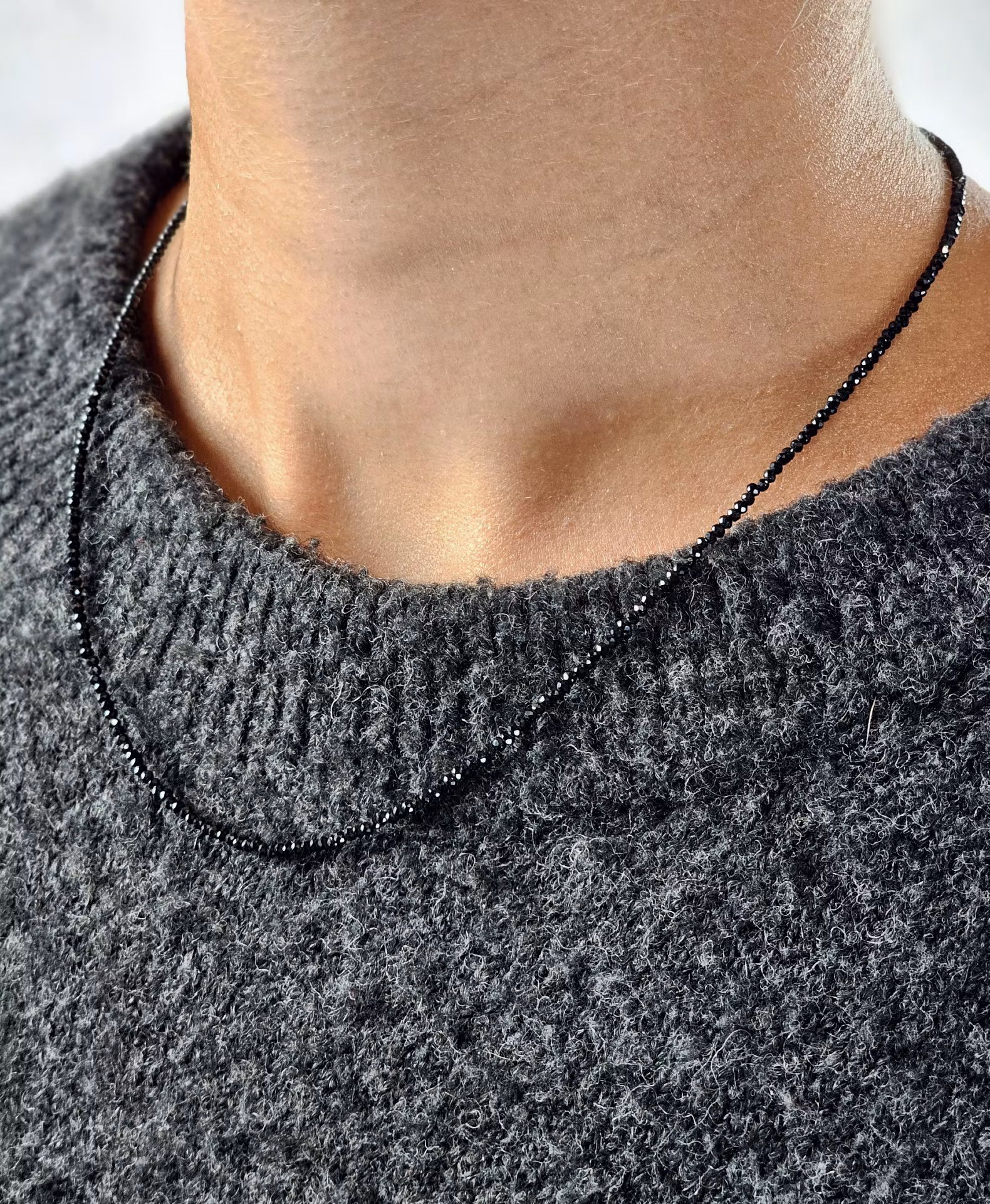 Svart Spinell, halsband 2mm facetterade pärlor 925s.