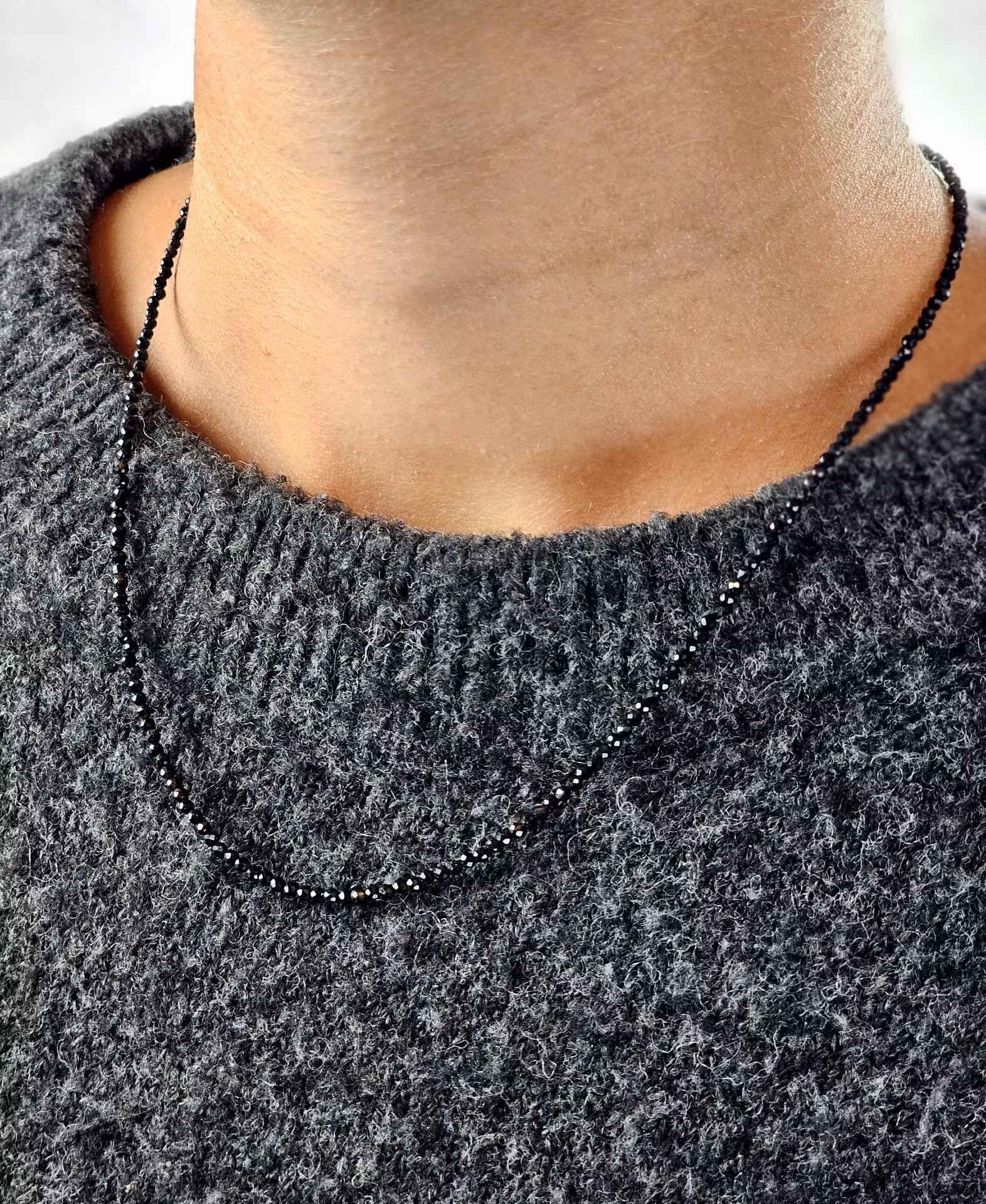 Svart Turmalin, halsband 2mm facetterade pärlor 925s.