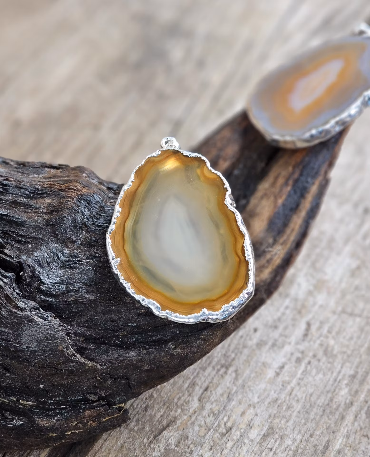 Silverpläterat hänge med väldigt fin polerad naturlig Agatskiva. De varierar i utseende. Säljes styckvis. Du köper slumpvis liknande smycke enligt text & bild ovan. Tänk på att kristaller kommer från naturen & naturliga sprickor & ojämnhet kan förekomma. Färger kan skilja sig beroende på hur ljuset faller ner på produkten samt även mellan olika bildskärmar m.m.