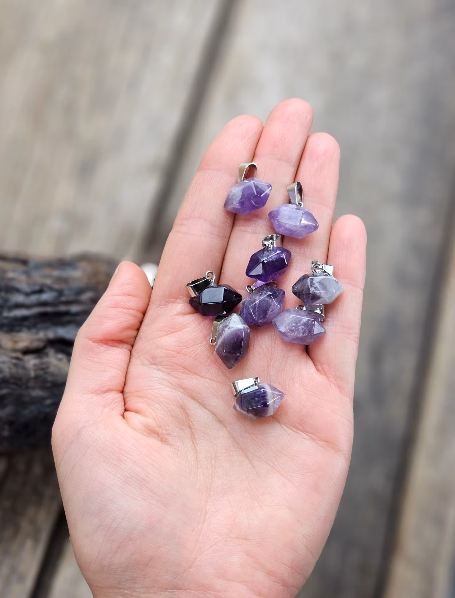 Vackert litet nätt silverpläterat hänge med fin dubbelterminerad polerad Ametistspets. De varierar i utseende. Säljes styckvis. Du köper ett slumpvis liknande smycke enligt text & bild ovan. Tänk på att kristaller kommer från naturen & naturliga sprickor & ojämnhet kan förekomma. Färger kan skilja sig beroende på hur ljuset faller ner på produkten samt även mellan olika bildskärmar m.m.