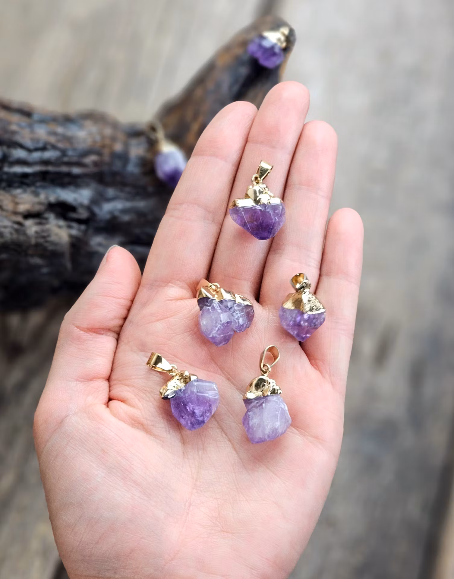 Så fint guldpläterat hänge med en vacker polerad Ametistspets/litet kluster. De varierar i utseende. Säljes styckvis. Du köper ett slumpvis liknande smycke enligt text & bild ovan. Tänk på att kristaller kommer från naturen & naturliga sprickor & ojämnheter kan förekomma. Färger kan skilja sig beroende på hur ljuset faller ner på produkten samt även mellan olika bildskärmar m.m.