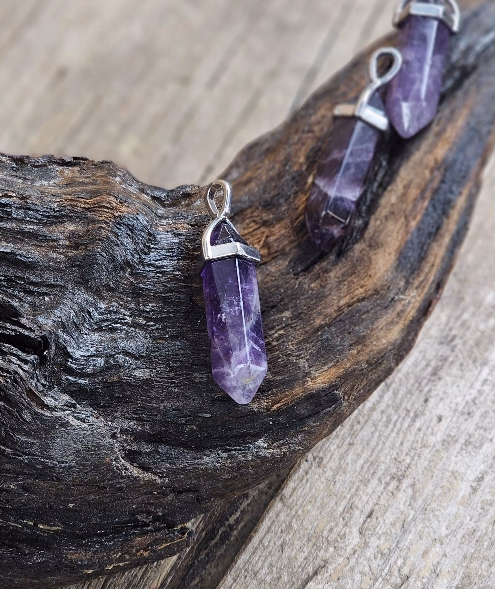 Underbara silverpläterade hängen med vacker polerad Ametistspets. De varierar i utseende. Säljes styckvis. Du köper ett slumpvis liknande smycke enligt text & bild ovan. Tänk på att kristaller kommer från naturen & naturliga sprickor & ojämnheter kan förekomma. Färger kan skilja sig beroende på hur ljuset faller ner på produkten samt även mellan olika bildskärmar m.m.