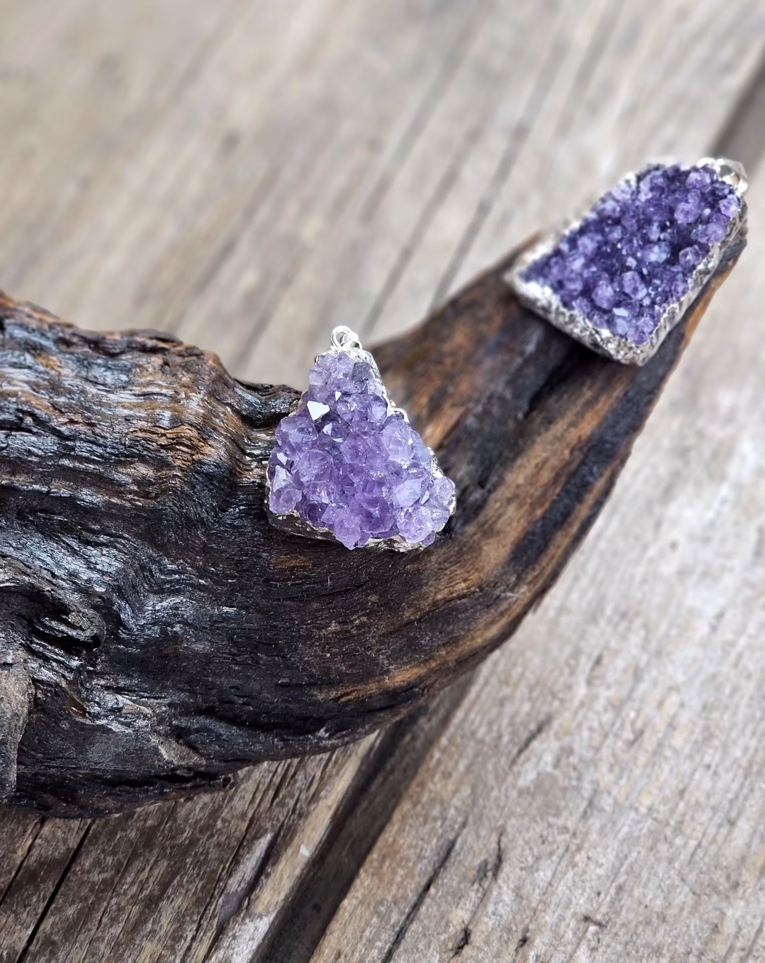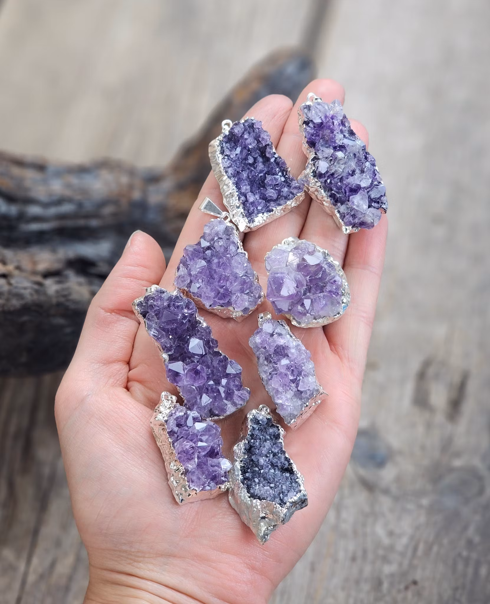Underbart vackert silverpläterat hänge med naturlig Ametistkluster. De varierar i utseende. Säljes styckvis. Du köper slumpvis liknande smycke enligt text & bild ovan. Tänk på att kristaller kommer från naturen & naturliga sprickor & ojämnheter kan förekomma. Färger kan skilja sig beroende på hur ljuset faller ner på produkten samt även mellan olika bildskärmar m.m.