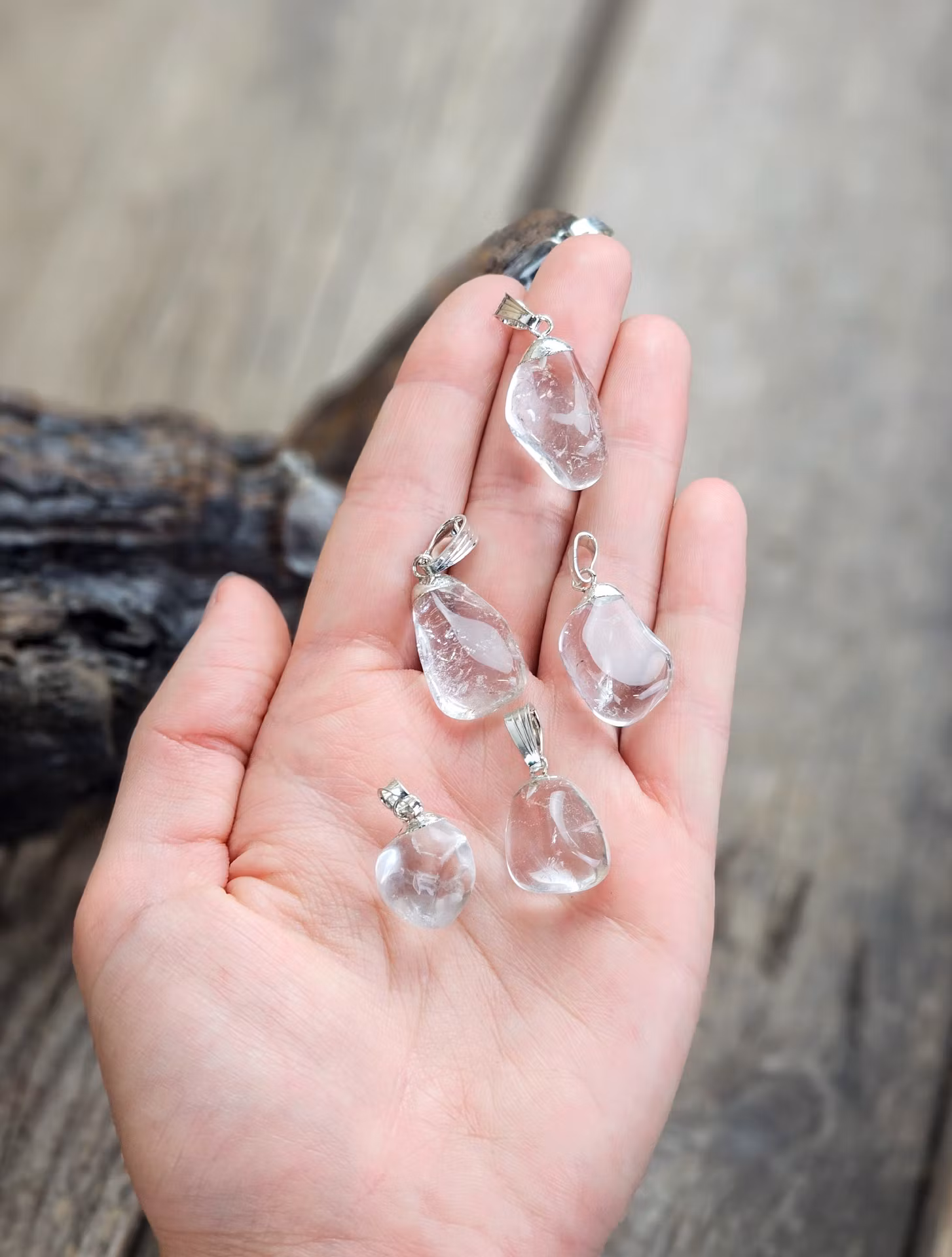 Jättefint silverpläterat hänge med vacker trumlad Bergkristall. De varierar i utseende och form. Säljes styckvis. Kedja ingår ej. Du köper ett smycke enligt text & bild. Tänk på att kristaller kommer från naturen, små skillnader kan därför förekomma i produktens utseende på grund av dess naturmaterial. Färger kan skilja sig beroende på hur ljuset faller ner på produkten samt även mellan olika bildskärmar m.m.