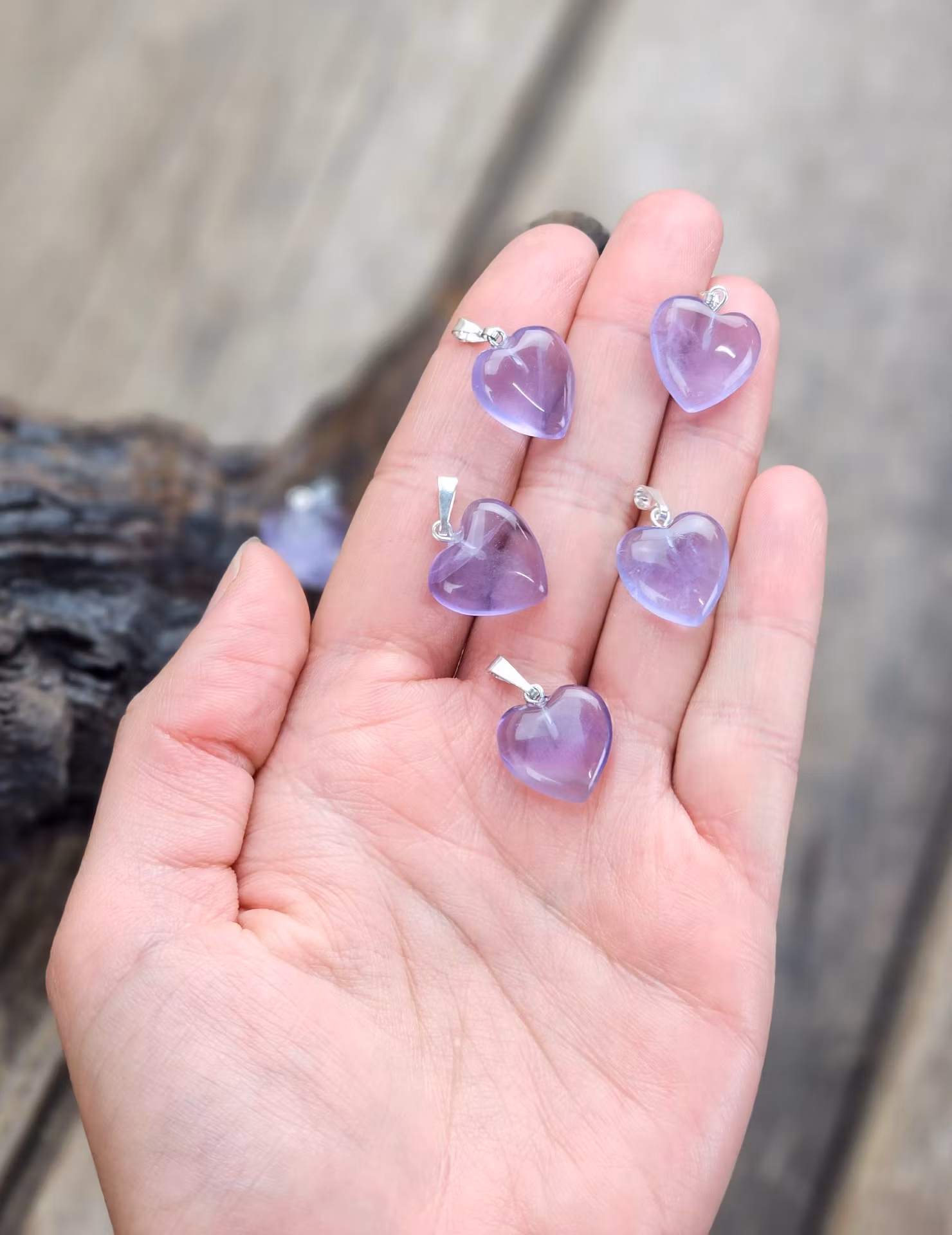 Vackert nätt silverpläterat hänge med form av ett fint hjärta i Lila Fluorit. De varierar i utseende. Säljes styckvis. Du köper ett smycke enligt text & bild. Tänk på att kristaller kommer från naturen, små skillnader kan därför förekomma i produktens utseende på grund av dess naturmaterial. Färger kan skilja sig beroende på hur ljuset faller ner på produkten samt även mellan olika bildskärmar m.m.