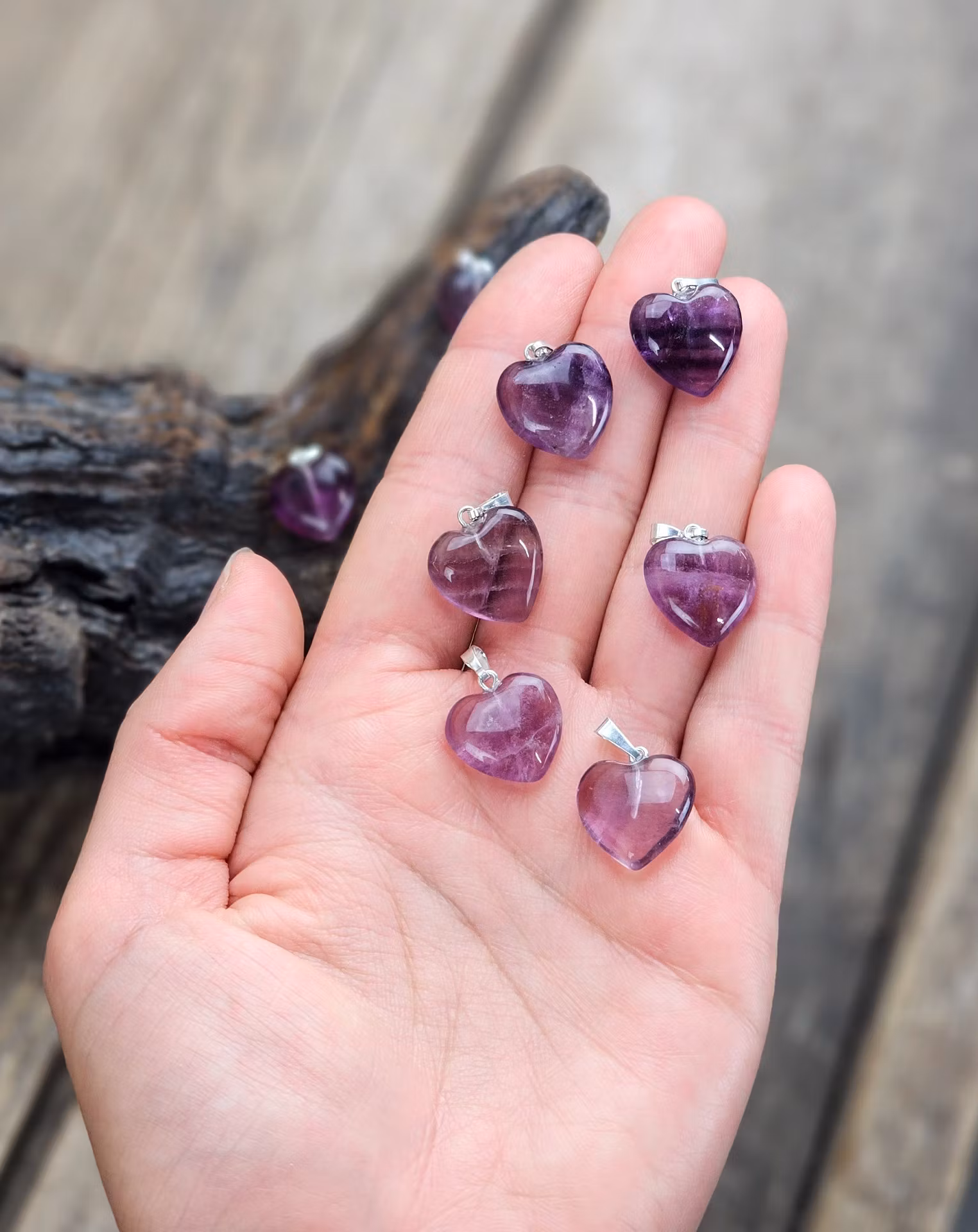 Vackert nätt silverpläterat hänge med form av ett fint hjärta i Mörklila Fluorit. De varierar i utseende. Säljes styckvis. Du köper ett smycke enligt text & bild. Tänk på att kristaller kommer från naturen, små skillnader kan därför förekomma i produktens utseende på grund av dess naturmaterial. Färger kan skilja sig beroende på hur ljuset faller ner på produkten samt även mellan olika bildskärmar m.m.