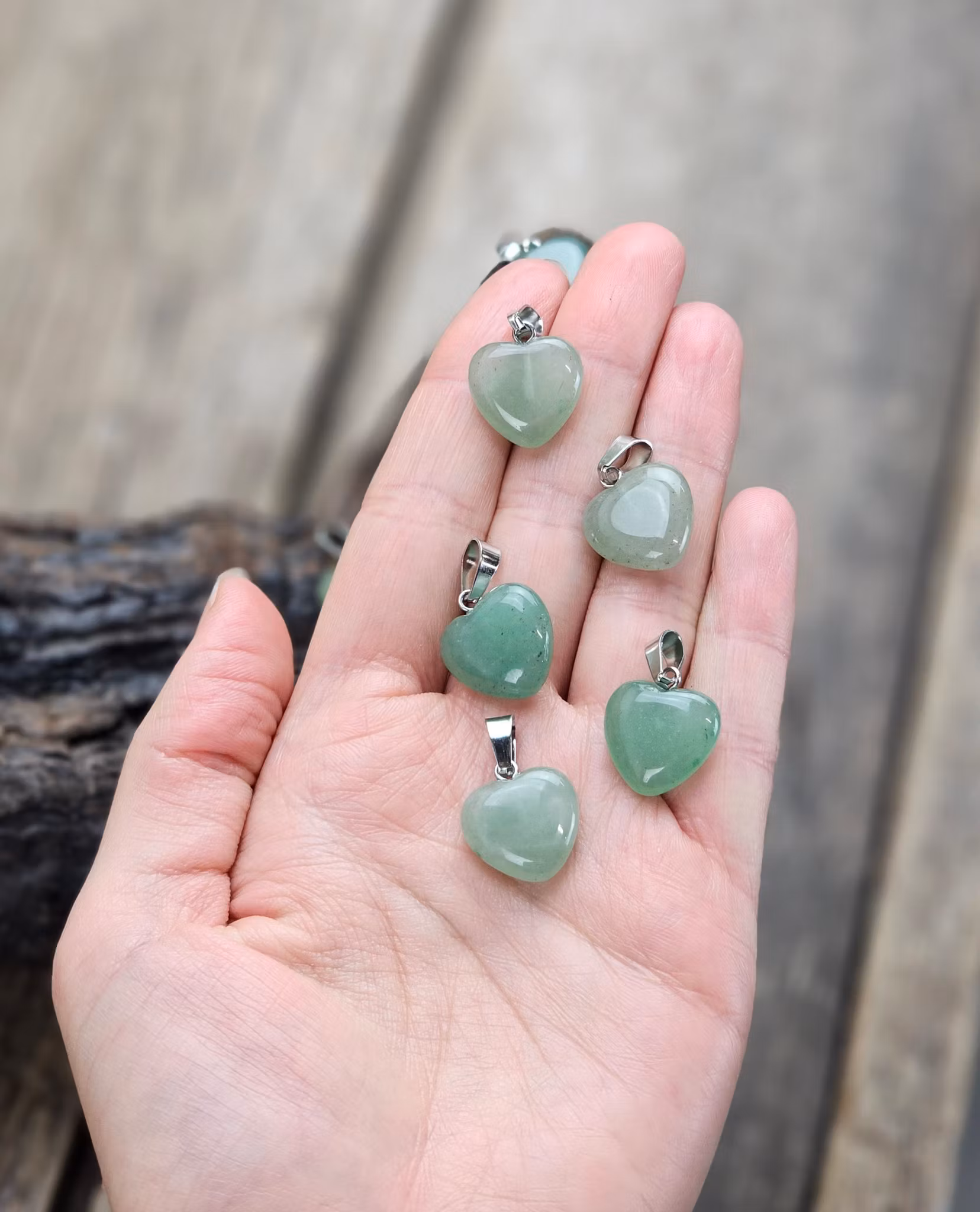 Vackert nätt silverpläterat hänge med ett fint hjärta i Grön Aventurin. De varierar i utseende. Säljes styckvis. Du köper ett slumpvis liknande smycke enligt text & bild ovan. Tänk på att kristaller kommer från naturen & naturliga sprickor & ojämnhet kan förekomma. Färger kan skilja sig beroende på hur ljuset faller ner på produkten samt även mellan olika bildskärmar m.m.