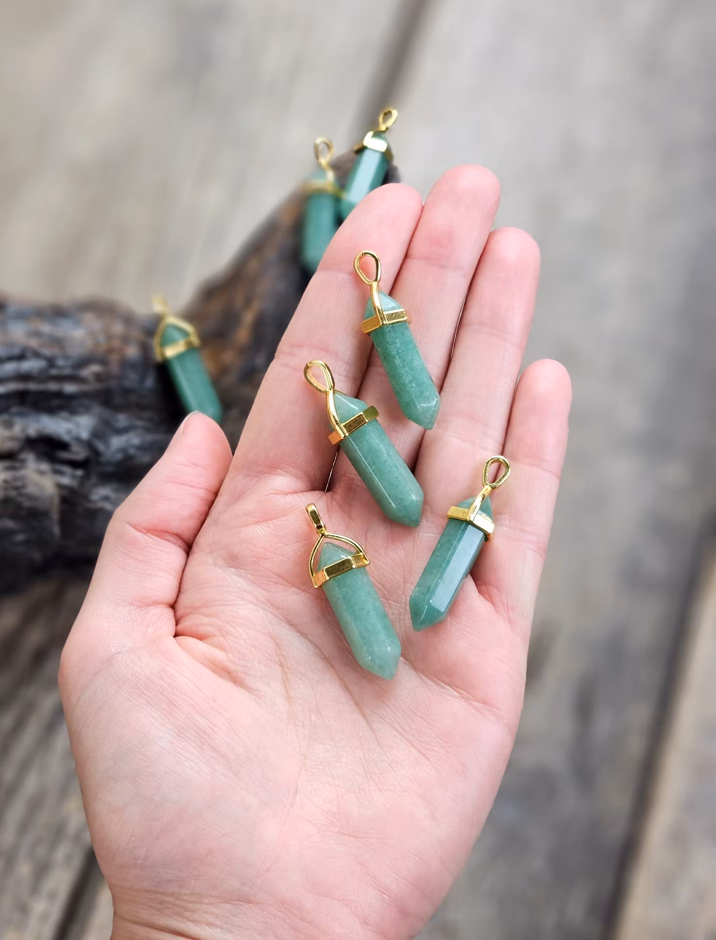 Så fint guldpläterat hänge med vacker polerad spets i Grön Aventurin. De varierar i utseende. Säljes styckvis. Du köper ett slumpvis liknande smycke enligt text & bild ovan. Tänk på att kristaller kommer från naturen & naturliga sprickor & ojämnhet kan förekomma. Färger kan skilja sig beroende på hur ljuset faller ner på produkten samt även mellan olika bildskärmar m.m.