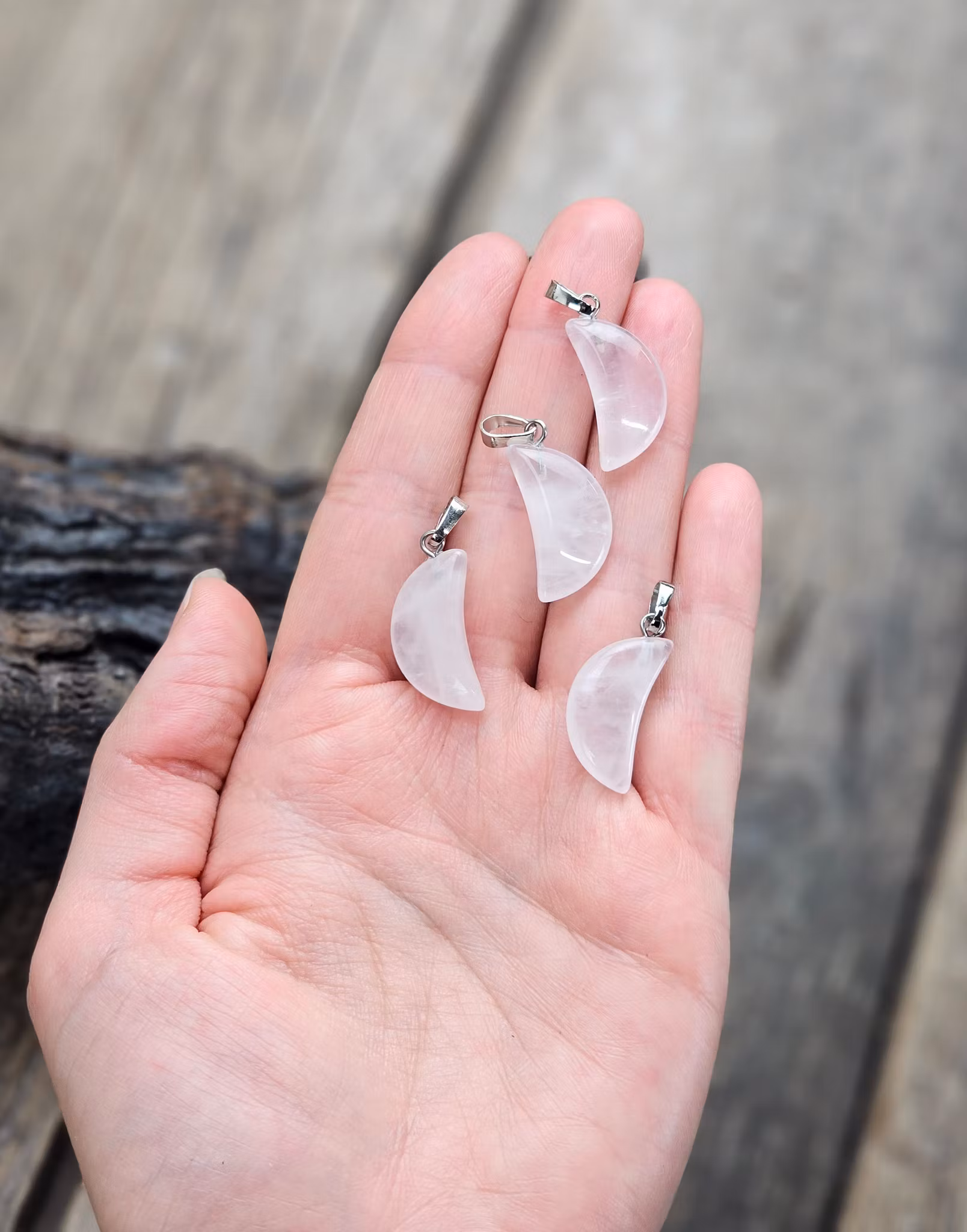 Mycket fint silverpläterat hänge med en vacker liten nätt måne i Rosenkvarts. De varierar i utseende. Säljes styckvis. Du köper ett smycke enligt text & bild ovan. Tänk på att kristaller kommer från naturen, små skillnader kan därför förekomma i produktens utseende på grund av dess naturmaterial. Färger kan skilja sig beroende på hur ljuset faller ner på kristallen samt även mellan olika bildskärmar m.m.