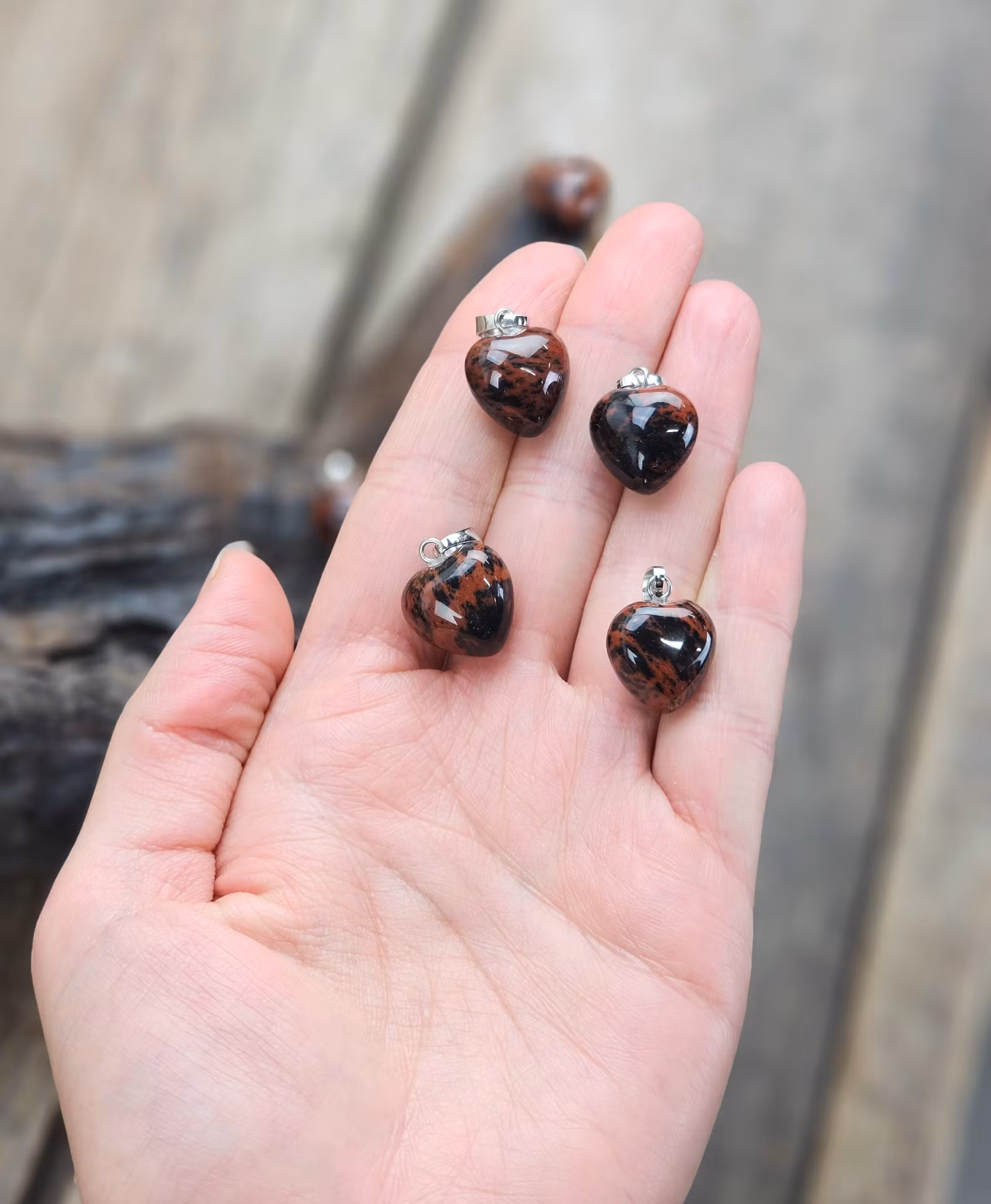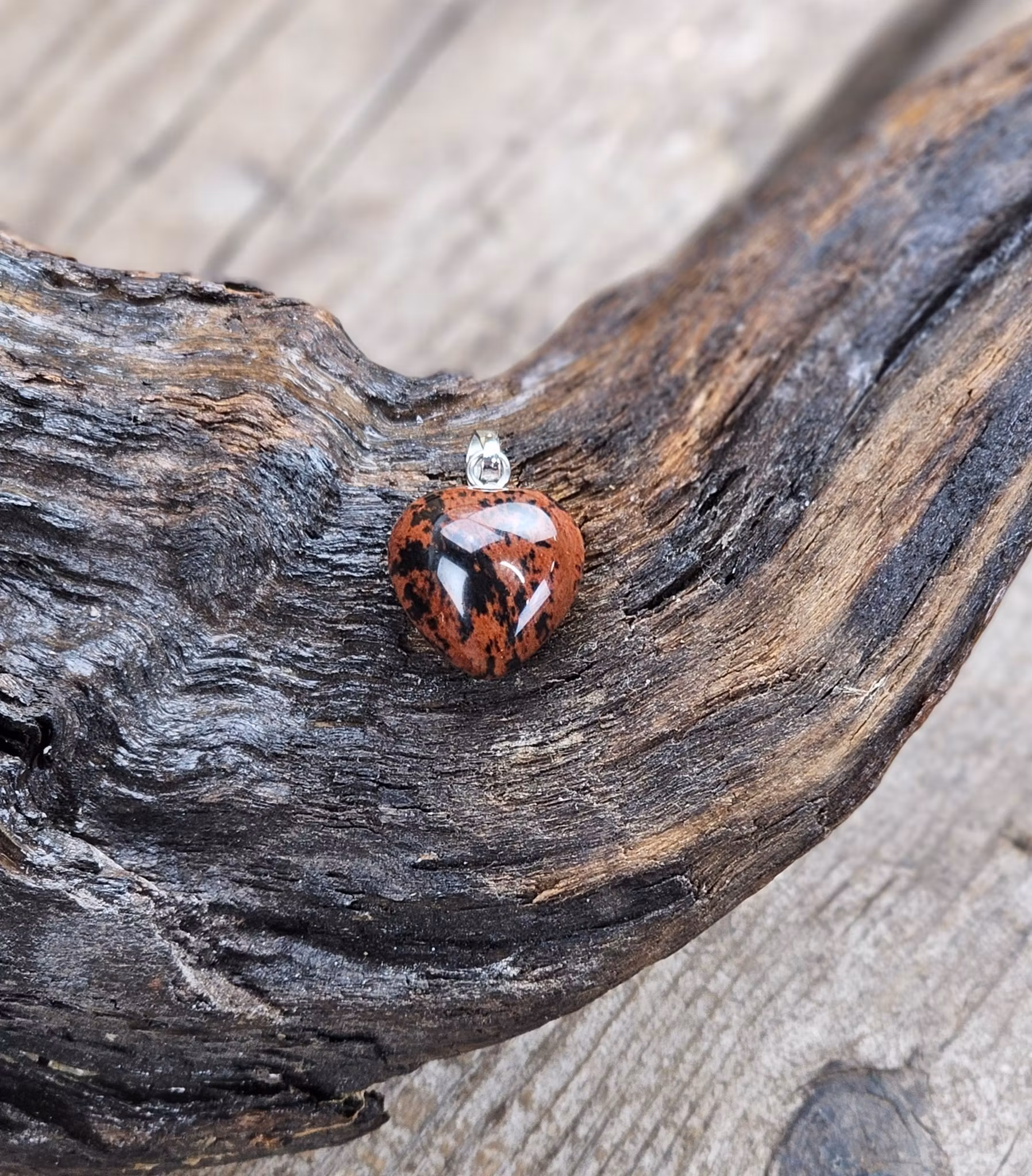 Vackert nätt silverpläterat hänge med ett fint hjärta i Mahogny Obsidian. De varierar i utseende. Säljes styckvis. Du köper ett slumpvis liknande smycke enligt text & bild ovan. Tänk på att kristaller kommer från naturen & naturliga sprickor & ojämnhet kan förekomma. Färger kan skilja sig beroende på hur ljuset faller ner på produkten samt även mellan olika bildskärmar m.m.
