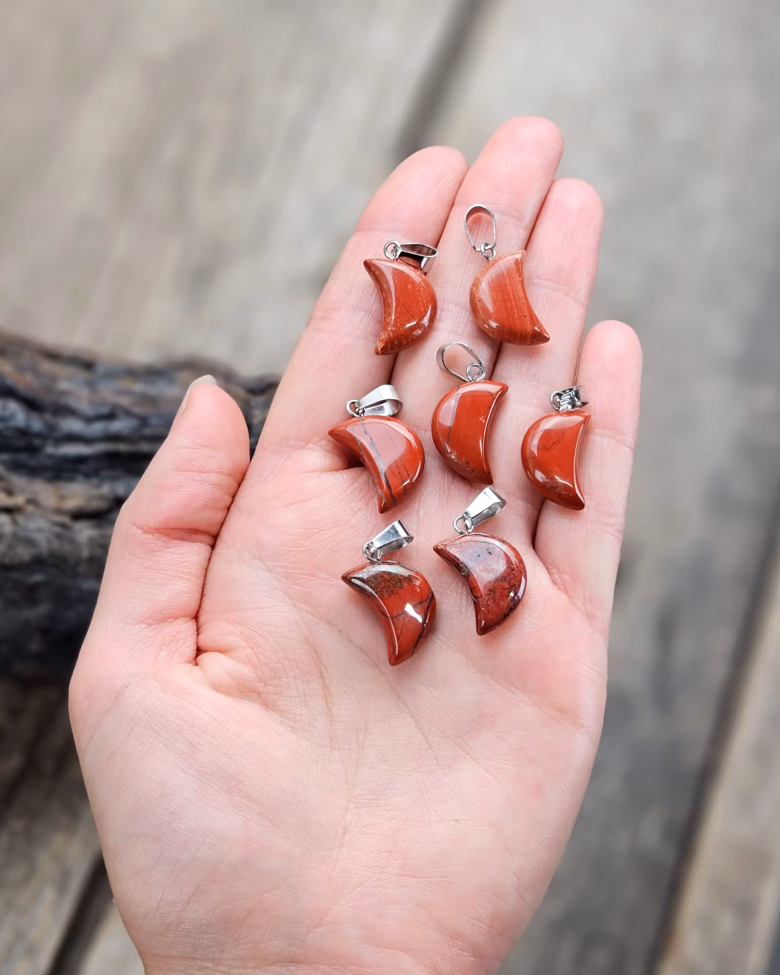 Fint silverpläterat hänge med en vacker liten nätt måne i Röd Jaspis. De varierar i utseende. Säljes styckvis. Du köper ett slumpvis liknande smycke enligt text & bild ovan. Tänk på att kristaller kommer från naturen & naturliga sprickor & ojämnheter kan förekomma. Färger kan skilja sig beroende på hur ljuset faller ner på produkten samt även mellan olika bildskärmar m.m.