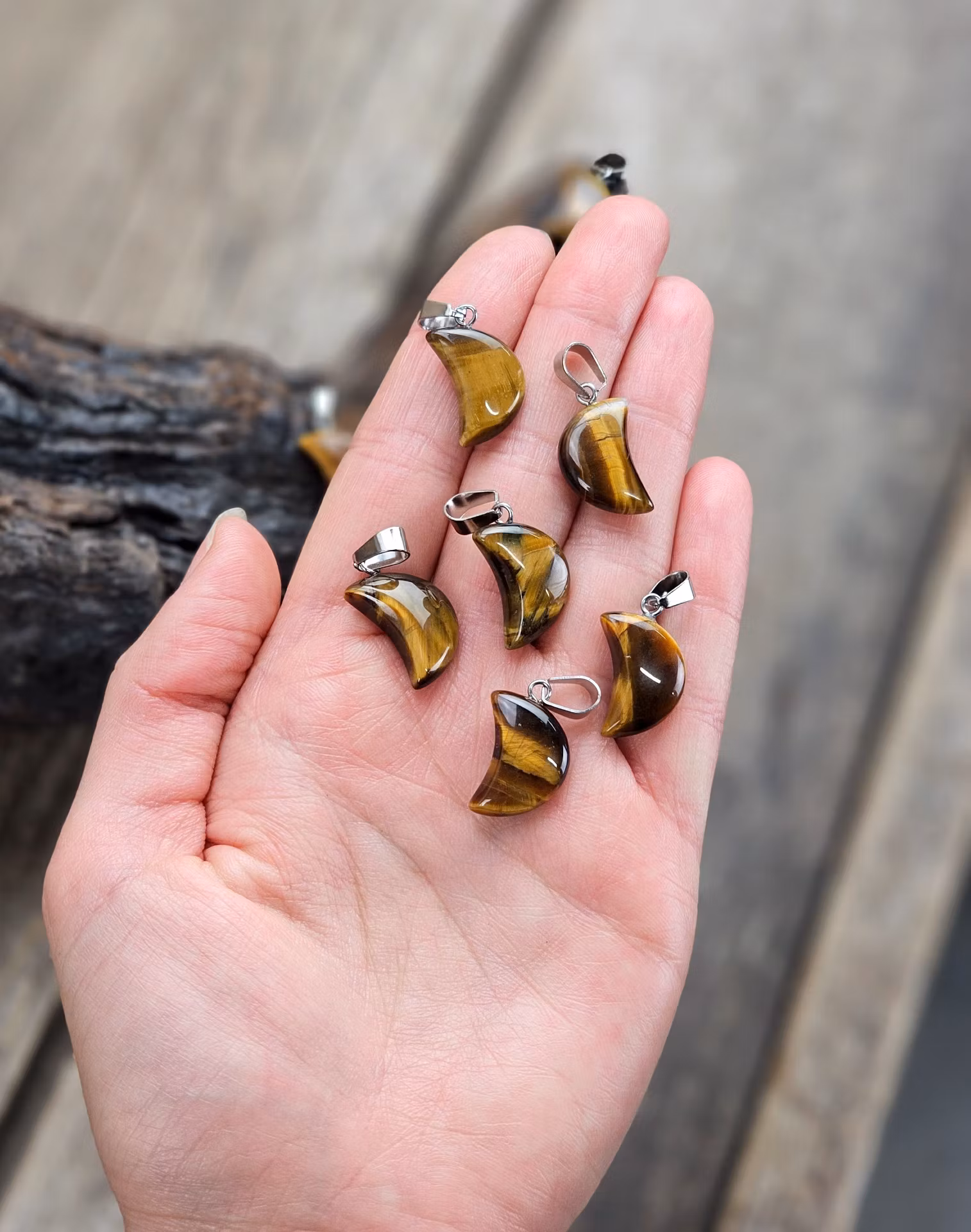 Fint silverpläterat hänge med en vacker liten nätt måne i Tigeröga. De varierar i utseende. Säljes styckvis. Du köper ett slumpvis liknande smycke enligt text & bild ovan. Tänk på att kristaller kommer från naturen & naturliga sprickor & ojämnheter kan förekomma. Färger kan skilja sig beroende på hur ljuset faller ner på produkten samt även mellan olika bildskärmar m.m.
