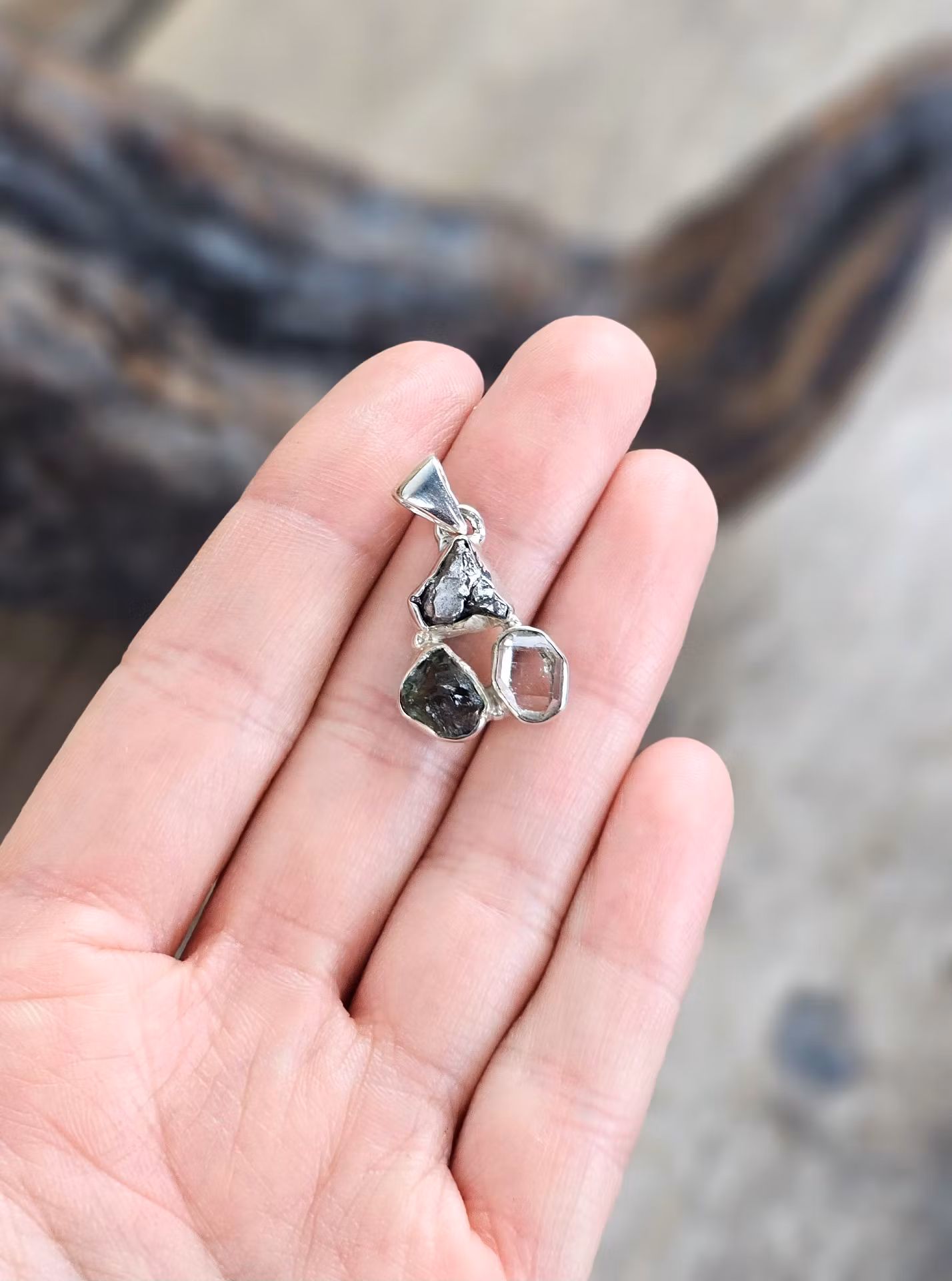 Moldavit, Meteorit & Herkimerdiamant, 925 silverinfattad hänge #1