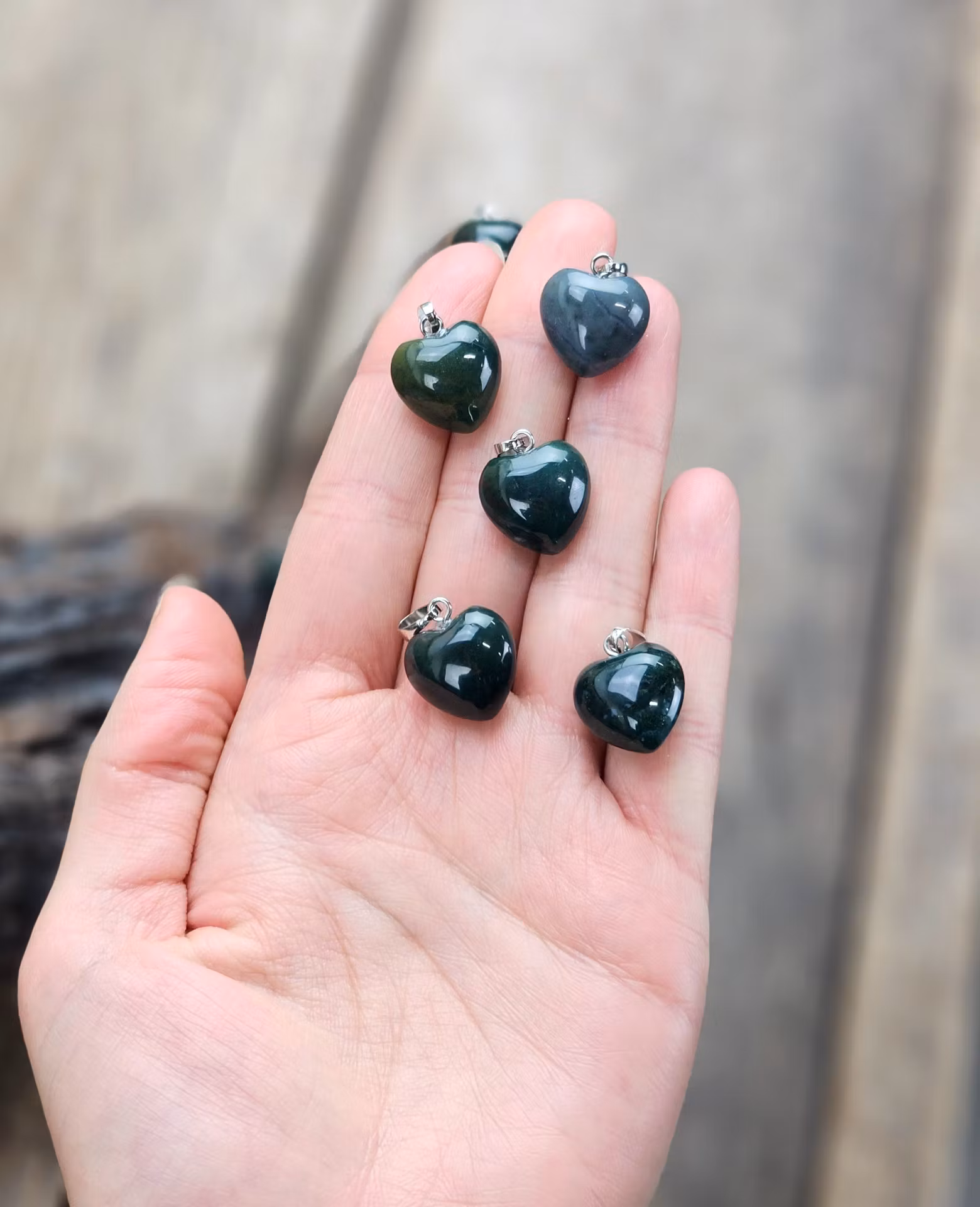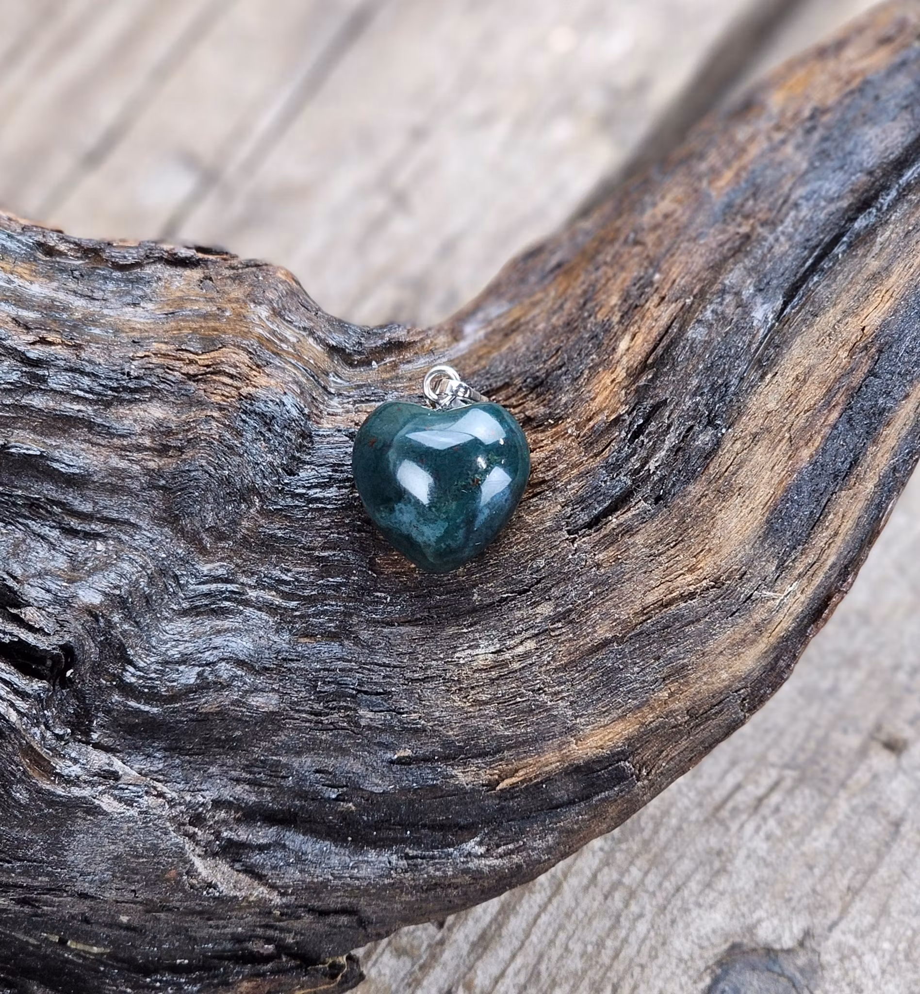 Vackert nätt silverpläterat hänge med ett fint hjärta i Mossagat. De varierar i utseende. Säljes styckvis. Du köper ett slumpvis liknande smycke enligt text & bild ovan. Tänk på att kristaller kommer från naturen & naturliga sprickor & ojämnhet kan förekomma. Färger kan skilja sig beroende på hur ljuset faller ner på produkten samt även mellan olika bildskärmar m.m.
