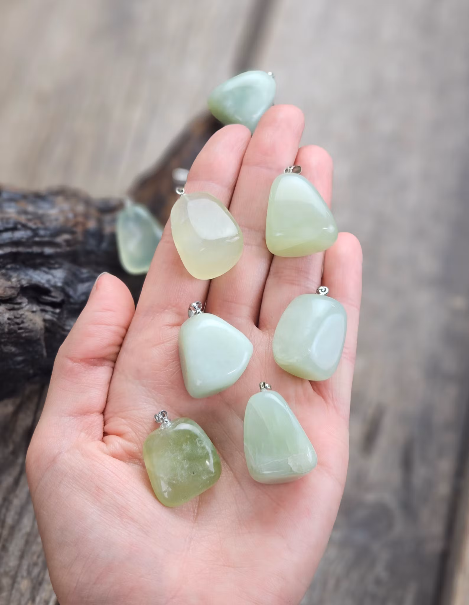 Jättefint silverpläterat hänge med en trumlad New Jade. De varierar i utseende och form. Säljes styckvis. Kedja ingår ej. Du köper ett smycke enligt text & bild. Tänk på att kristaller kommer från naturen, små skillnader kan därför förekomma i produktens utseende på grund av dess naturmaterial. Färger kan skilja sig beroende på hur ljuset faller ner på produkten samt även mellan olika bildskärmar m.m.