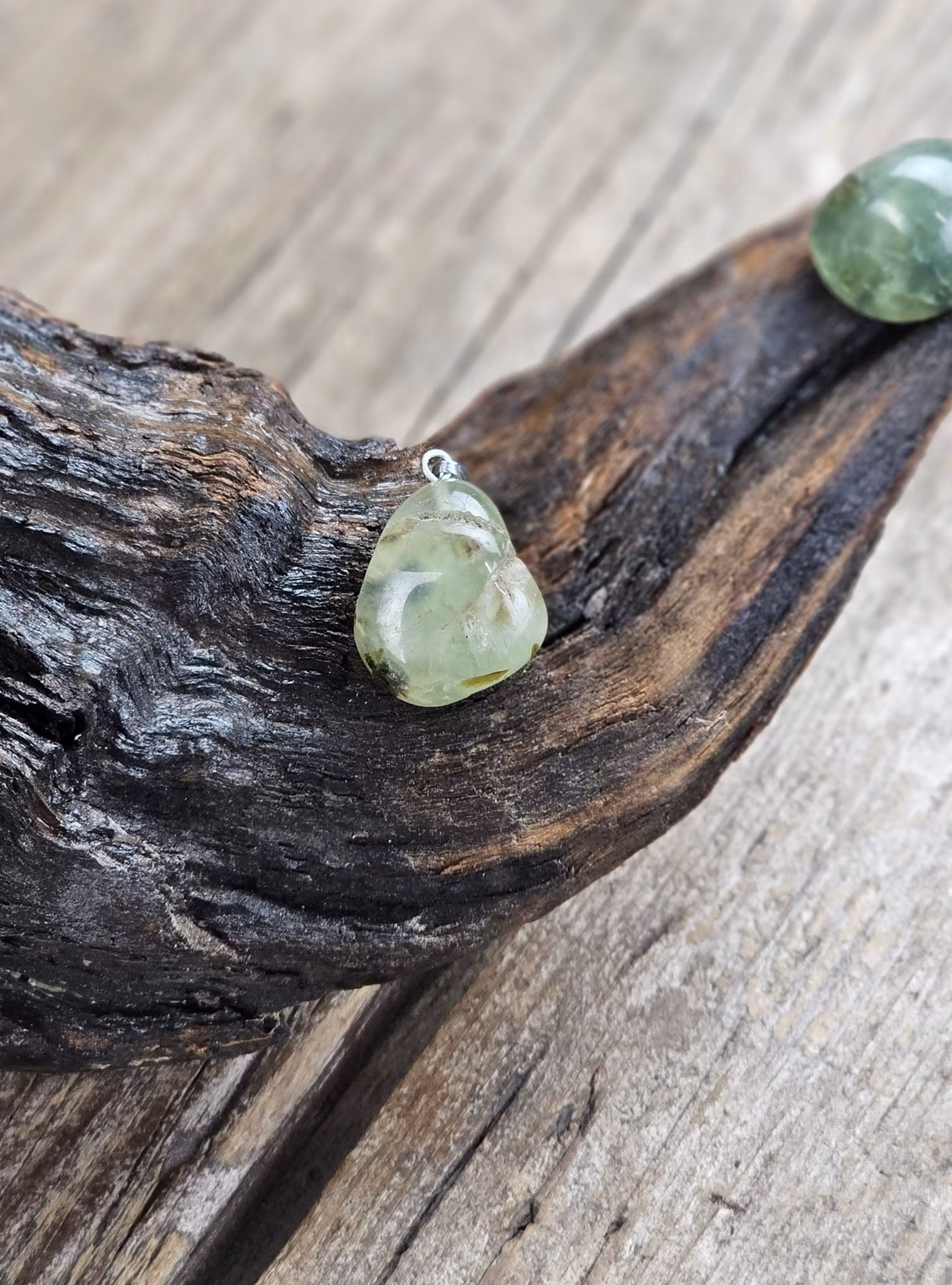 Prehnit trumlad, silverpläterat hänge