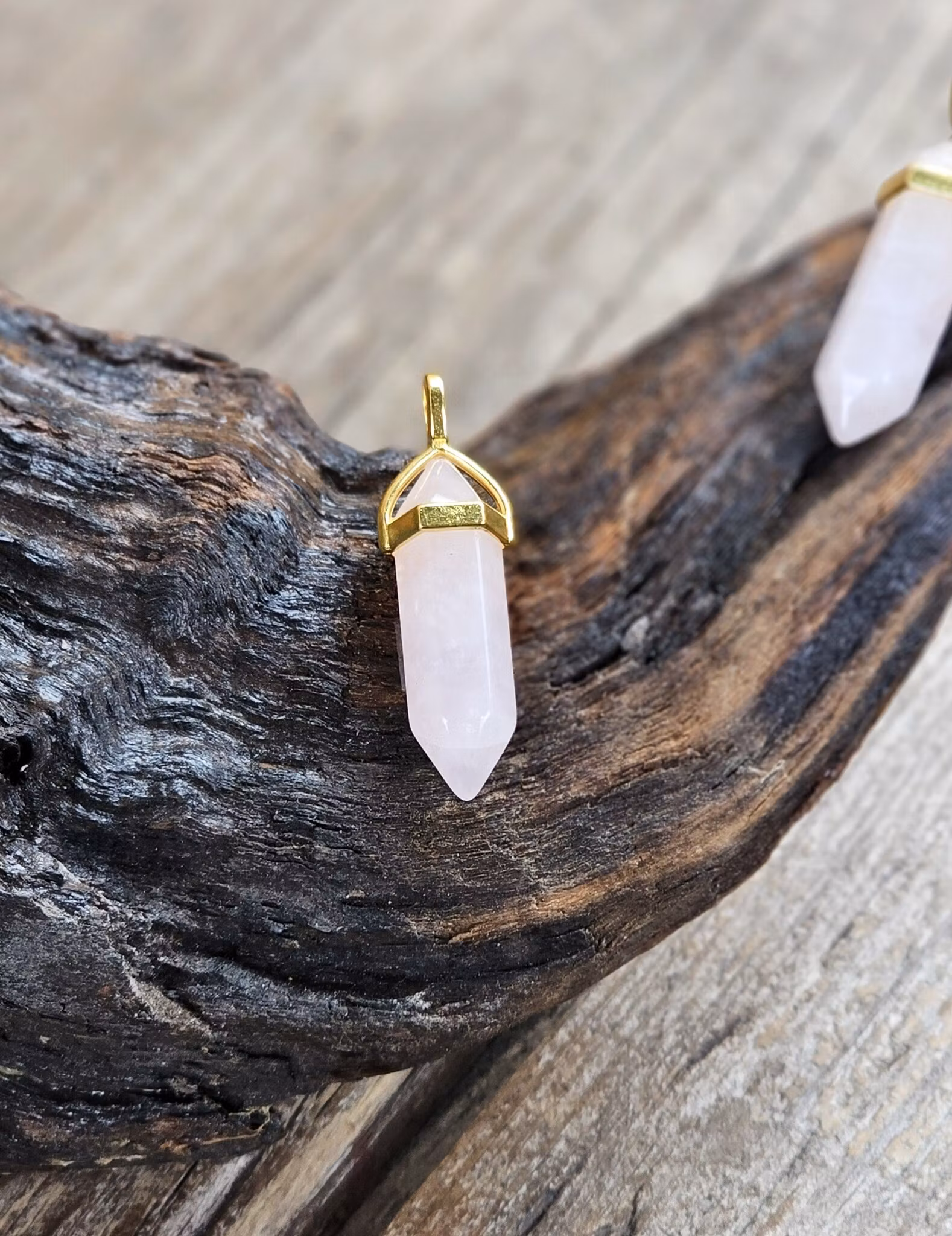 Så fint guldpläterat hänge med vacker polerad spets i Rosenkvarts. De varierar i utseende. Säljes styckvis. Du köper ett smycke enligt text & bild ovan. Tänk på att kristaller kommer från naturen, små skillnader kan därför förekomma i produktens utseende på grund av dess naturmaterial. Färger kan skilja sig beroende på hur ljuset faller ner på kristallen samt även mellan olika bildskärmar m.m.