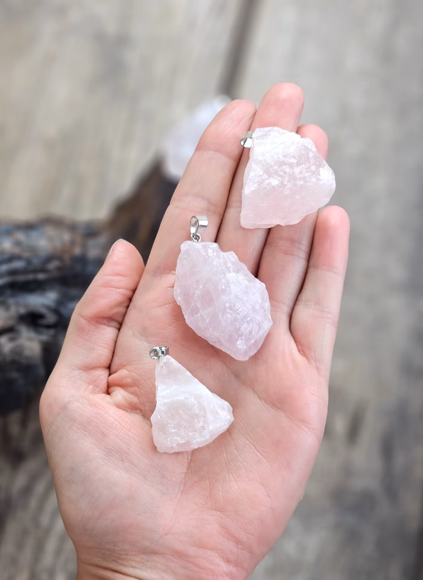Vackert silverpläterat hänge med rå stor Rosenkvarts. De varierar i utseende och form. Säljes styckvis. Du köper ett smycke enligt text & bild ovan. Tänk på att kristaller kommer från naturen, små skillnader kan därför förekomma i produktens utseende på grund av dess naturmaterial. Färger kan skilja sig beroende på hur ljuset faller ner på kristallen samt även mellan olika bildskärmar m.m.
