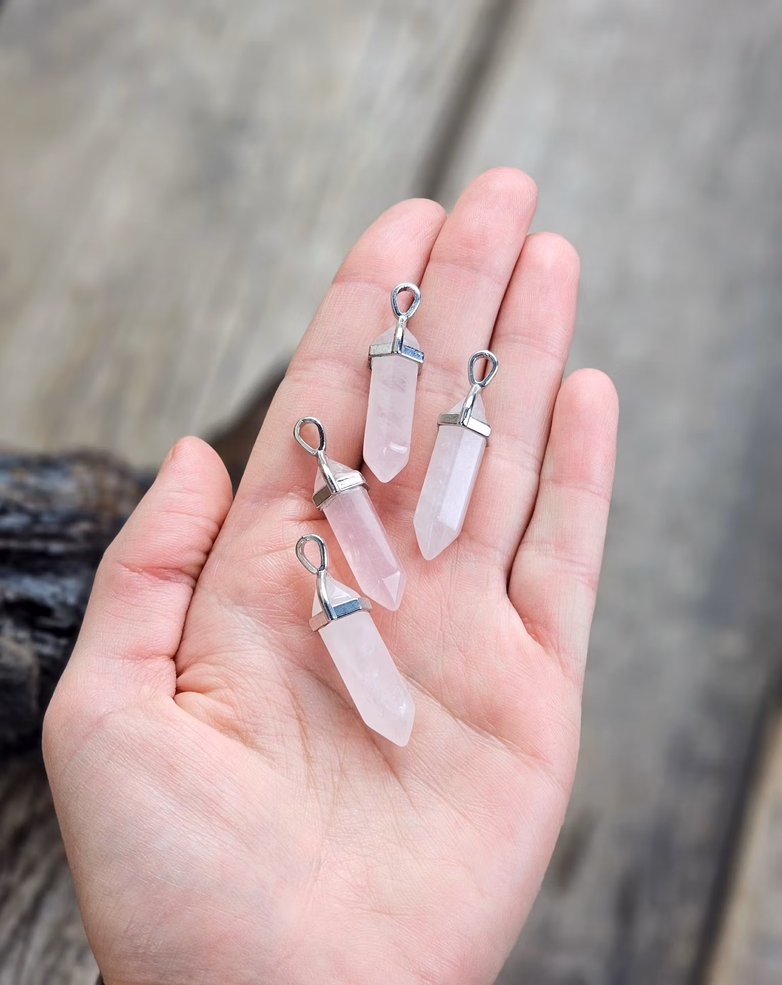 Mycket fint silverpläterat hänge med vacker polerad spets i Rosenkvarts. De varierar i utseende. Säljes styckvis. Du köper ett smycke enligt text & bild ovan. Tänk på att kristaller kommer från naturen, små skillnader kan därför förekomma i produktens utseende på grund av dess naturmaterial. Färger kan skilja sig beroende på hur ljuset faller ner på kristallen samt även mellan olika bildskärmar m.m.